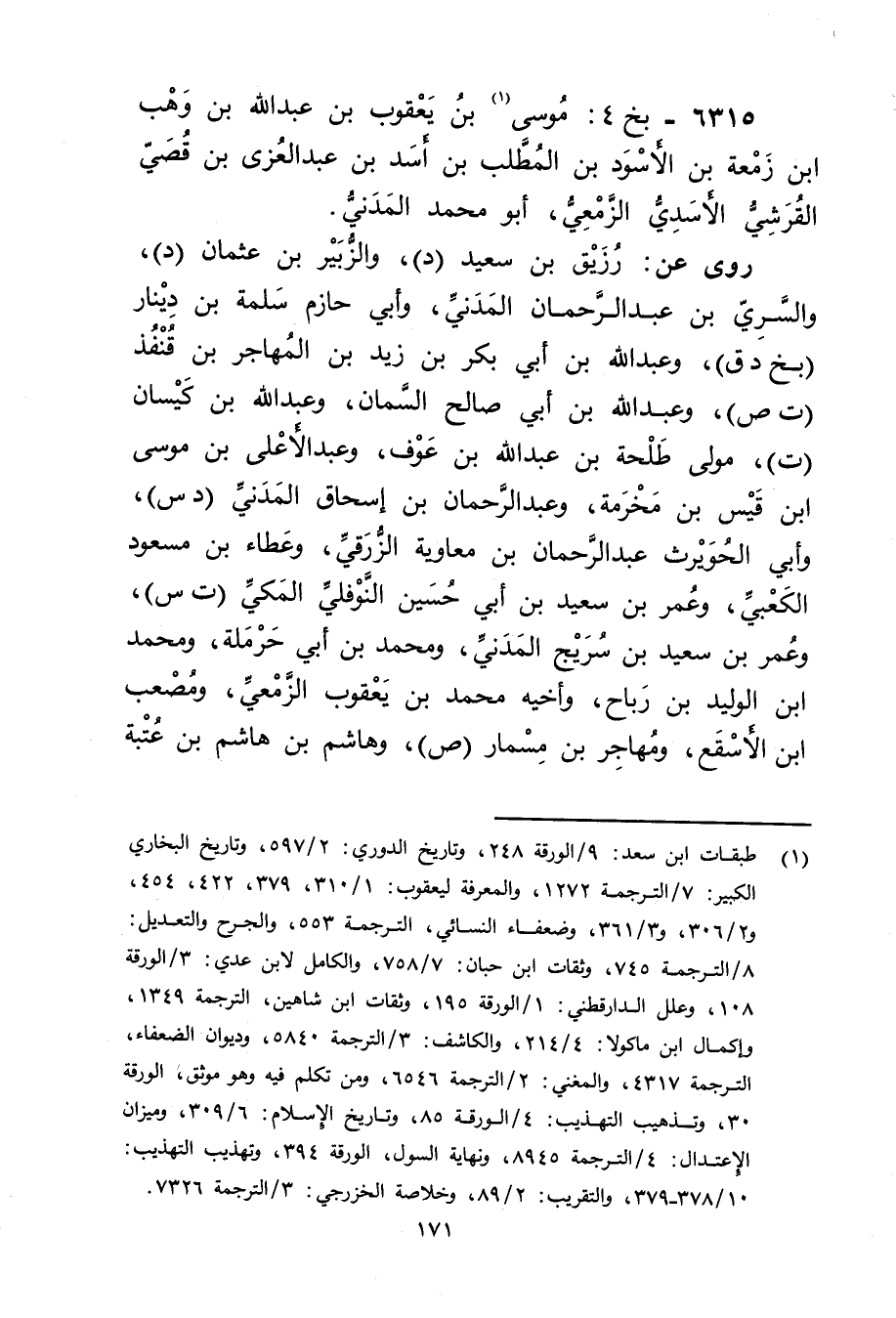 6315 - بخ 4: مُوسَى بن يَعْقُوبَ بن عَبد اللَّه بْن وهب ابن زمعة بن الأسود بن المطلب بن أسد بن عبد العزى بن قصي القرشي الأسدي الزمعي (1) ، أَبُو مُحَمَّد المدني.