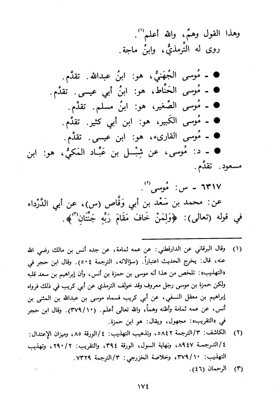 (2) الكاشف: 3 / الترجمة 5842، وتذهيب التهذيب: 4 / الورقة 85، وميزان الاعتدال: 4 / الترجمة 8947، ونهاية السول، الورقة 394، والتقريب: 2 / 290، وتهذيب التهذيب: 10 / 379، وخلاصة الخزرجي: 3 / الترجمة 7329.