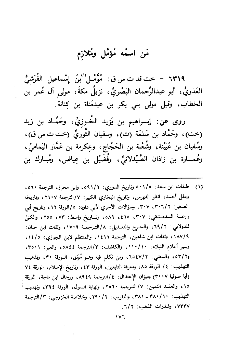 6319 - خت قد ت س ق: مؤمل بن إِسماعيل القرشي العدوي (1) ، أَبُو عَبْد الرَّحْمَنِ البَصْرِيّ، نزيل مكة، مولى آل عُمَر بْن الخطاب، وقيل مولى بني بكر بن عَبْد مناة بْن كنانة.