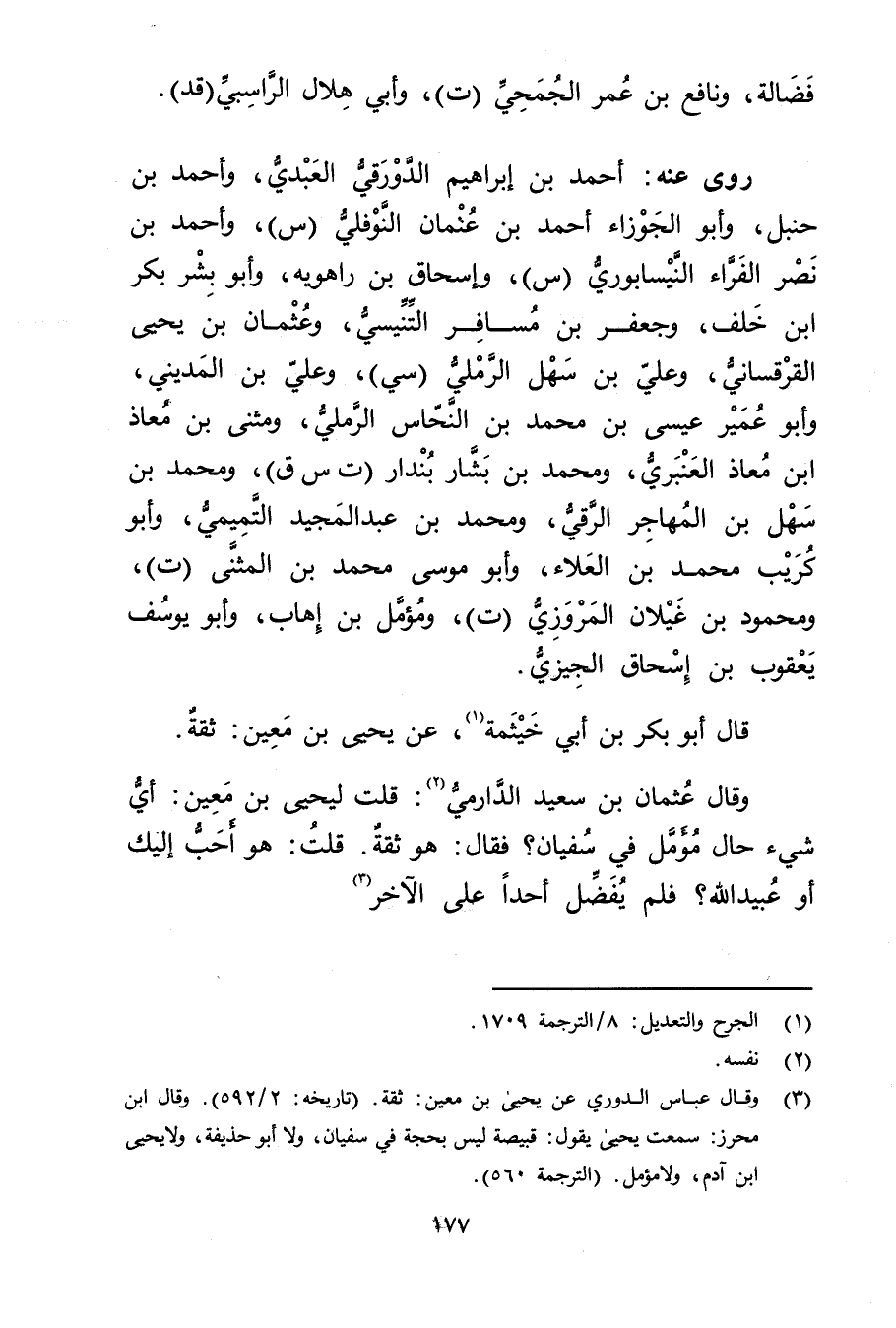 (3) وَقَال عَباس الدُّورِيُّ عَن يحيى بن مَعِين: ثقة. (تاريخه: 2 / 592) . وَقَال ابن محرز: سمعت يحيى يقول: قبيصة ليس بحجة في سفيان، ولا أبو حذيفة، ولا يحيى ابن آدم، ولا مؤمل. (الترجمة 560) .
