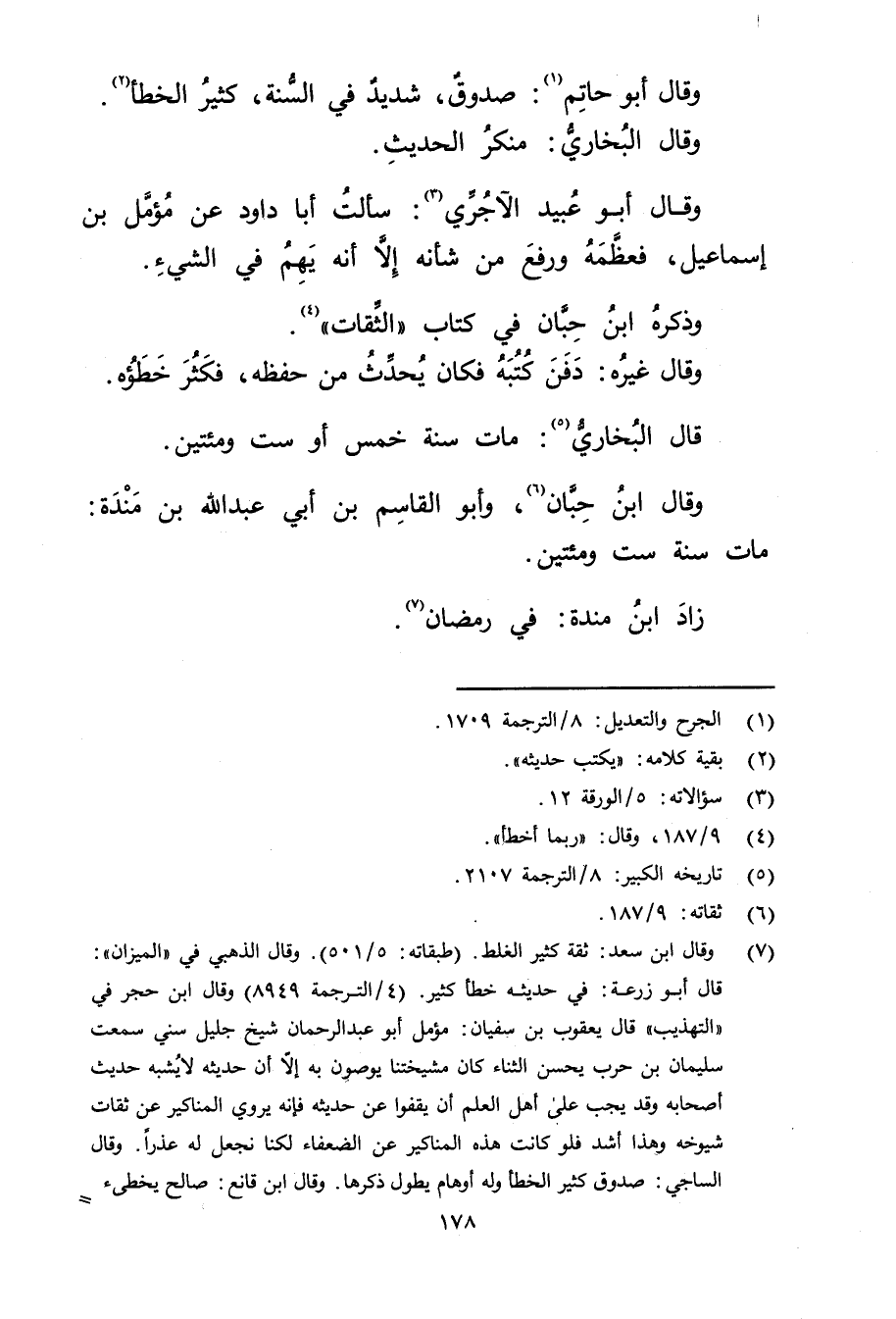 (7) وَقَال ابن سعد: ثقة كثير الغلط. (طبقاته: 5 / 501) . وَقَال الذهبي في " الميزان": قال أَبُو زُرْعَة: فِي حديثه خطأ كثير. (4 / الترجمة 8949) وَقَال ابن حجر في " التهذيب" قال يعقوب بن سفيان: مؤمل أبو عبد الرحمن شيخ جليل سني سمعت سُلَيْمان بن حرب يحسن الثناء كان مشيختنا يوصون به الا ان حديثه لا يشبه حديث اصحابه وقد يجب على اهل العلم ان يقفوا عن حديثه فانه يروي المناكير عن ثقات شيوخه وهذا اشد فلو كانت هذه المناكير عن الضعفاء لكنا نجعل له عذرا. وَقَال الساجي: صدوق كثير الخطأ وله أوهام يطول ذكرها.