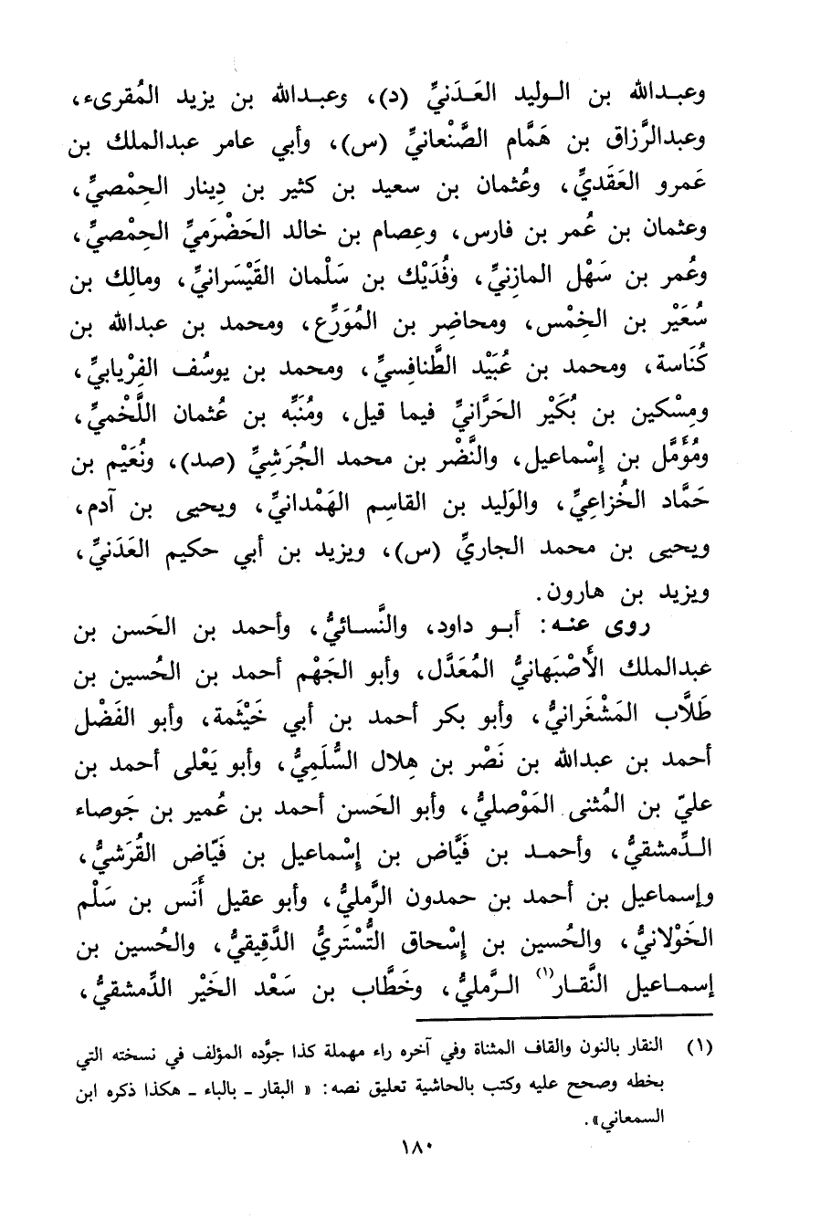 (1) النقار بالنون والقاف المثناة وفي آخره راء مهملة كذا جوده المؤلف في نسخته التي بخطه وصحح عليه وكبت بالحاشية تعليق نصه: البقار - بالباء - هكذا ذكره ابن السمعاني".
