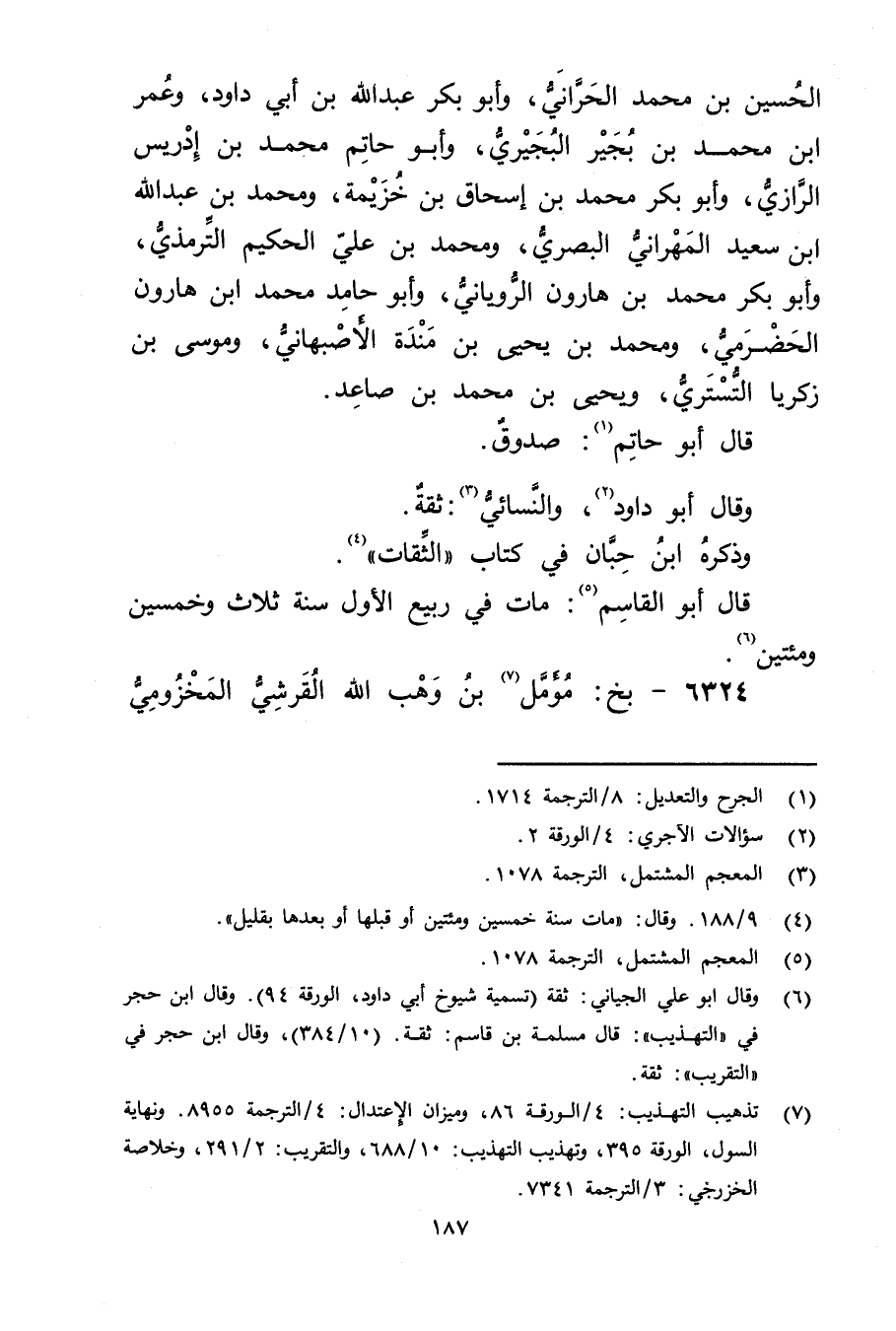 (7) تذهيب التهذيب: 4 / الورقة 86، وميزان الاعتدال: 4 / الترجمة 8955، ونهاية السول، الورقة 395، وتهذيب التهذيب: 10 / 688، والتقريب: 2 / 291، وخلاصة الخزرجي: 3 / الترجمة 7341.