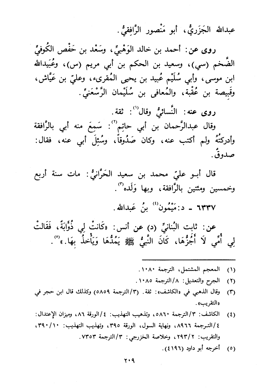 (4) الكاشف: 3 / الترجمة 5860، وتذهيب التهذيب: 4 / الورقة 86، وميزان الاعتدال: 4 / الترجمة 8966، ونهاية السول، الورقة 395، وتهذيب التهذيب: 10 / 390، والتقريب: 2 / 293، وخلاصة الخزرجي: 3 / الترجمة 7353.