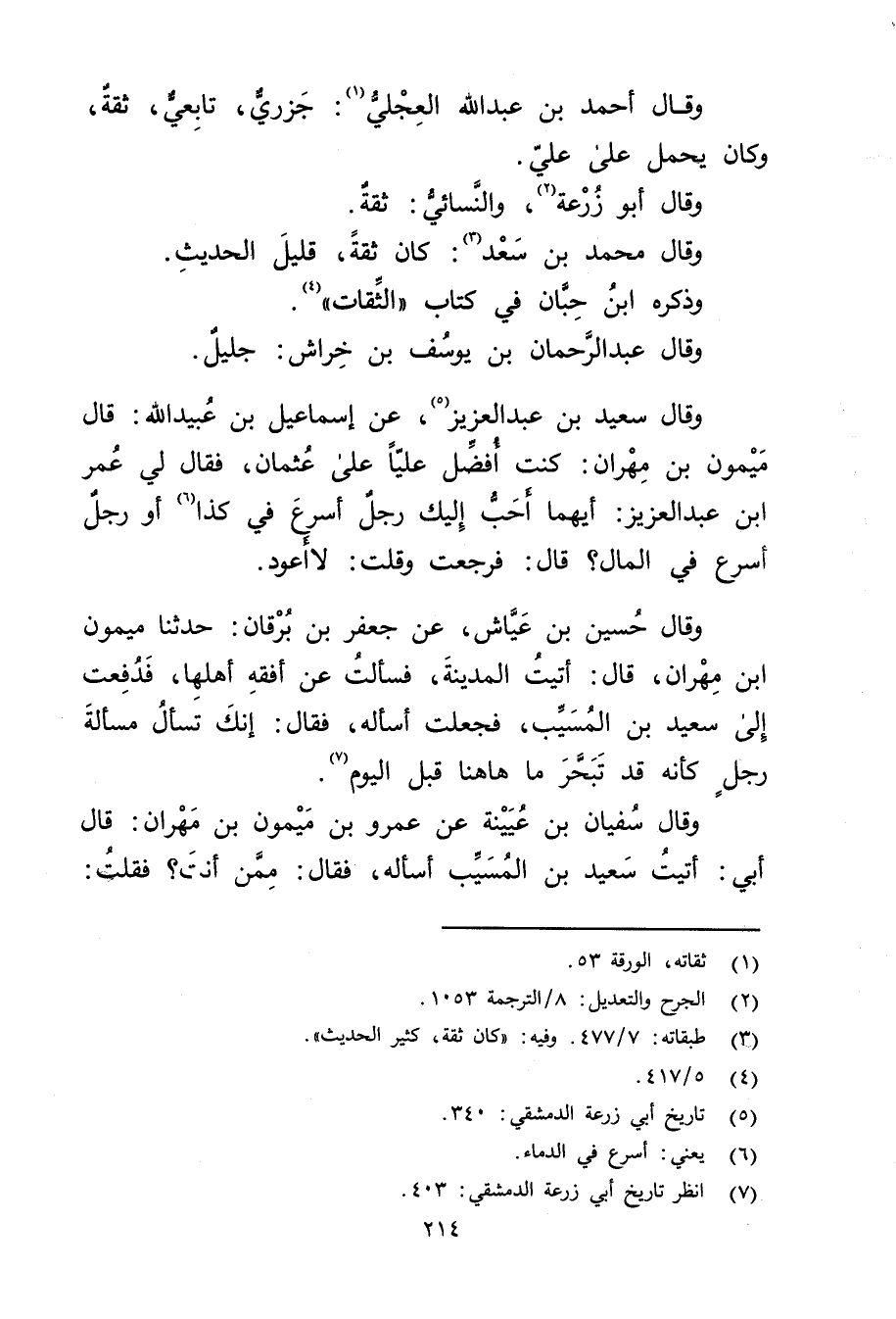 وَقَال حسين بن عَيَّاشٍ، عن جعفر بن برقان: حَدَّثَنَا ميمون ابن مهران، قال: أتيت المدينة، فسألت عن أفقه أهلها، فدفعت إِلَى سَعِيد بن المُسَيَّب، فجعلت أسأله، فَقَالَ: إنك تسأل مسألة رجل كأنه قد تبحر ما هاهنا قبل اليوم (7) .