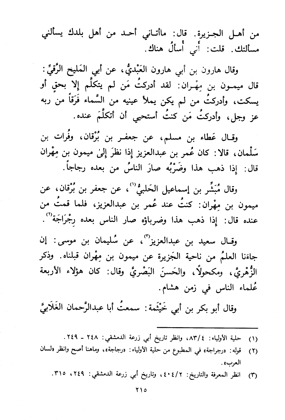 وَقَال سَعِيد بن عبد العزيز (3) ، عن سُلَيْمان بْن مُوسَى: أن جاءنا العلم من ناحية الجزيرة عَن ميمون بْن مهران قبلناه. وذكر الزُّهْرِيّ، ومكحولا، والحسن البَصْرِيّ وَقَال: كَانَ هؤلاء الأربعة علماء الناس فِي زمن هشام.