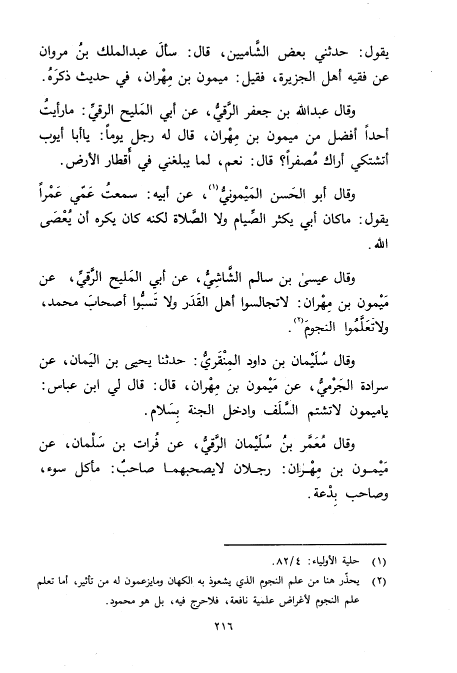 وَقَال عِيسَى بن سالم الشاشي، عَن أَبِي المليح الرَّقِّيّ، عن ميمون بن مهران: لا تجالسوا أهل القدر ولا تسبوا أصحاب مُحَمَّد، ولا تعلموا النجوم (2) .