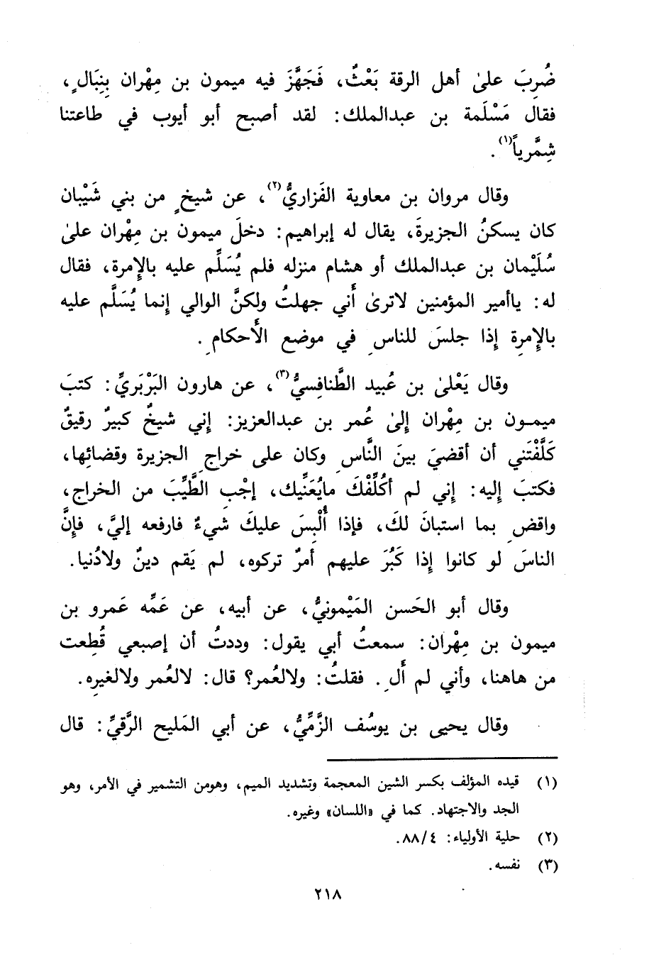 وَقَال مروان بن معاوية الفزاري (2) ، عن شيخ من بني شيبان كَانَ يسكن الجزيرة، يقال لَهُ إبراهيم: دخل ميمون بن مهران عَلَى سُلَيْمان بن عَبْدِ الْمَلِكِ أو هشام منزله فلم يسلم عَلَيْهِ بالإمرة، فَقَالَ لَهُ: يا أمير المؤمنين لا ترى أني جهلت ولكن الوالي إنما يسلم عَلَيْهِ بالإمرة إِذَا جلس للناس فِي موضع الإحكام.