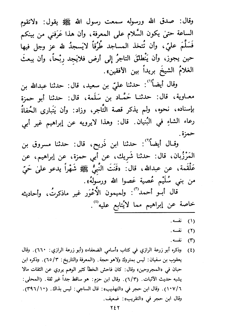 وَقَال أَيْضًا (1) : حَدَّثَنَا عَلِيّ بْن سَعِيد، قال: حَدَّثَنَا عَبد اللَّهِ بْنُ مُعَاوِيَةَ، قال: حَدَّثَنَا حماد بْن سلمة، قال: حَدَّثَنَا أَبُو حَمْزَةَ بِإِسْنَادِهِ، نَحْوَهُ، ولَمْ يَذْكُرْ قِصَّةَ التَّاجِرِ، وزَادَ: وأَنْ يَتَبَارَى الْحُفَاةُ رُعَاءُ الشَّاءِ فِي الْبُنْيَانِ. قال: وهَذَا لا يرويه عَنْ إِبْرَاهِيمَ غَيْرُ أَبِي حَمْزَةَ.