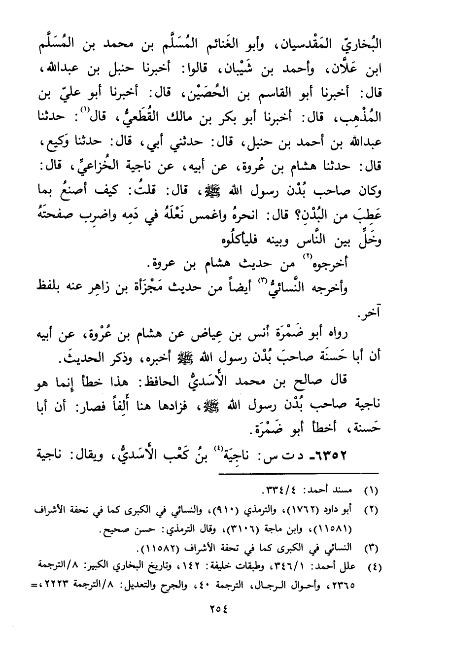 الْبُخَارِيّ المقدسيان، وأَبُو الغنائم المسلم بن محمد بن المسلم ابن عَلانَ، وأَحمد بْنُ شَيْبَانَ، قَالُوا: أَخبرنا حنبل بْن عَبد الله، قال: أَخبرنا أبو القاسم بْن الحصين، قال: أَخبرنا أبو علي بْن المذهب، قال: أَخبرنا أبو بكر بن مالك القطعي، قال، (1) : حَدَّثَنَا عَبد اللَّهِ بْن أحمد بْن حنبل، قال: حَدَّثني أَبِي، قال: حَدَّثَنَا وكِيعٌ، قال: حَدَّثَنَا هِشَامُ بْنُ عُرْوَةَ، عَن أَبِيهِ، عَنْ نَاجِيَةَ الْخُزَاعِيِّ، قال: وكَانَ صَاحِبَ بُدْنِ رَسُولِ اللَّهِ صلى الله عليه وسلم، قال: قُلْتُ: كَيْفَ أَصْنَعُ بِمَا عَطِبَ مِنَ الْبُدْنِ؟ قال: انْحَرْهُ واغْمِسْ نَعْلَهُ فِي دَمِهِ واضْرِبْ صَفْحَتَهُ وخَلِّ بَيْنَ النَّاسِ وبَيْنَهُ فَلْيَأْكُلُوهُ