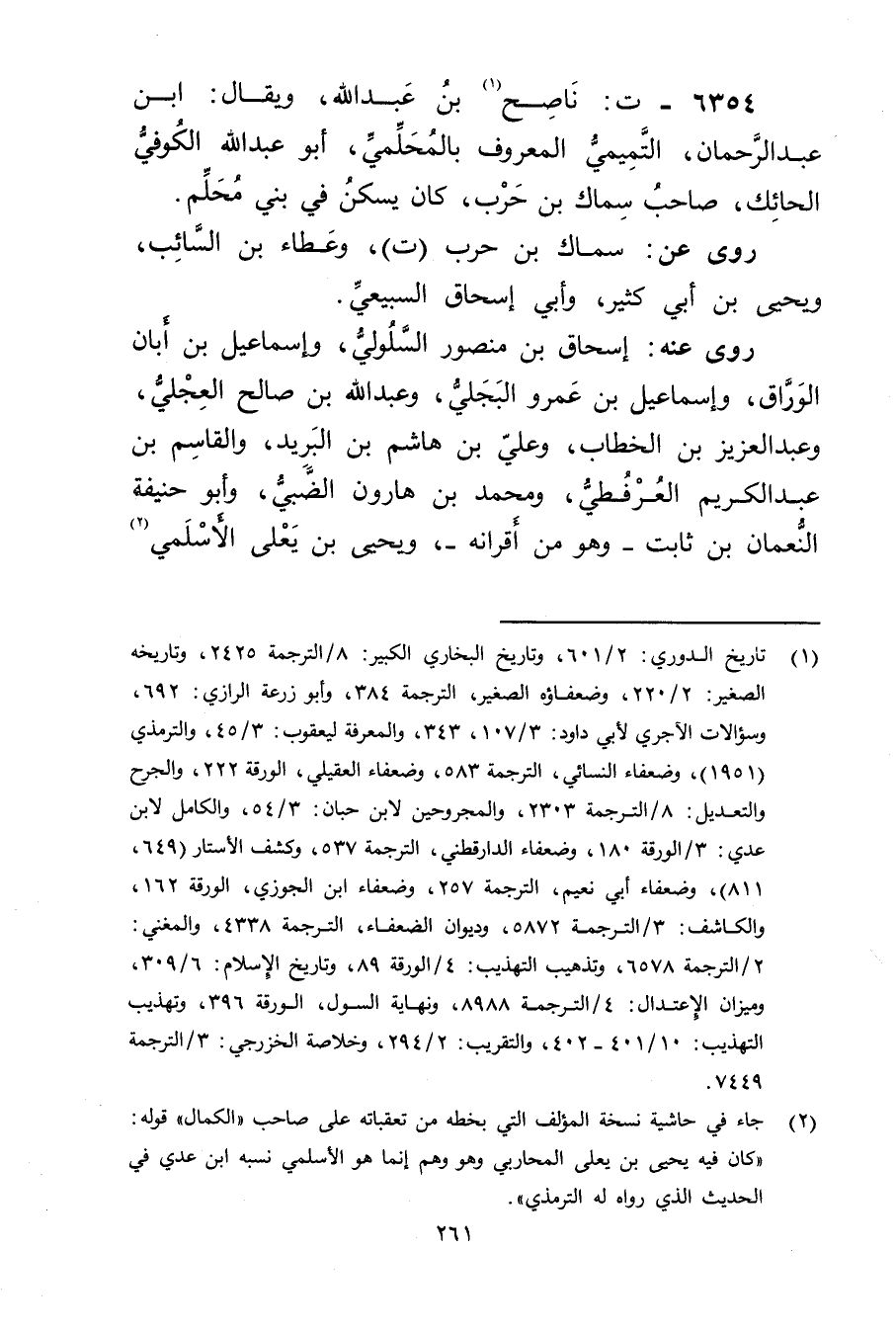 6354 - ت: ناصح بن عَبد اللَّهِ (1) ، ويُقال: ابن عبد الرحمن، التميمي المعروف بالمحلمي، أَبُو عَبد اللَّهِ الكوفي الحائك، صاحب سماك بن حرب، كان يسكن فِي بني محلم.