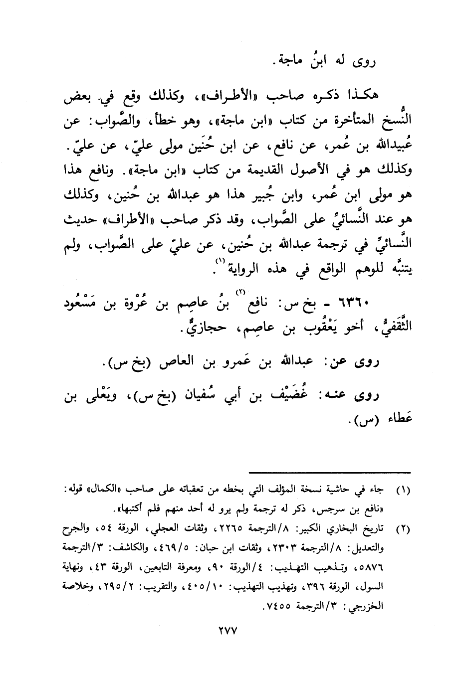 وكذلك هو فِي الأصول القديمة من كتاب" ابن مَاجَهْ". ونافع هَذَا هو مولى ابن عُمَر، وابن جبير هَذَا هو عَبد اللَّهِ بن حنين، وكذلك هو عند النَّسَائي عَلَى الصواب، وقد ذكر صاحب" الأطراف" حديث النَّسَائي فِي ترجمة عَبد اللَّهِ بْن حنين، عن علي عَلَى الصواب، ولم يتنبه للوهم الواقع فِي هَذِهِ الرواية (1) .