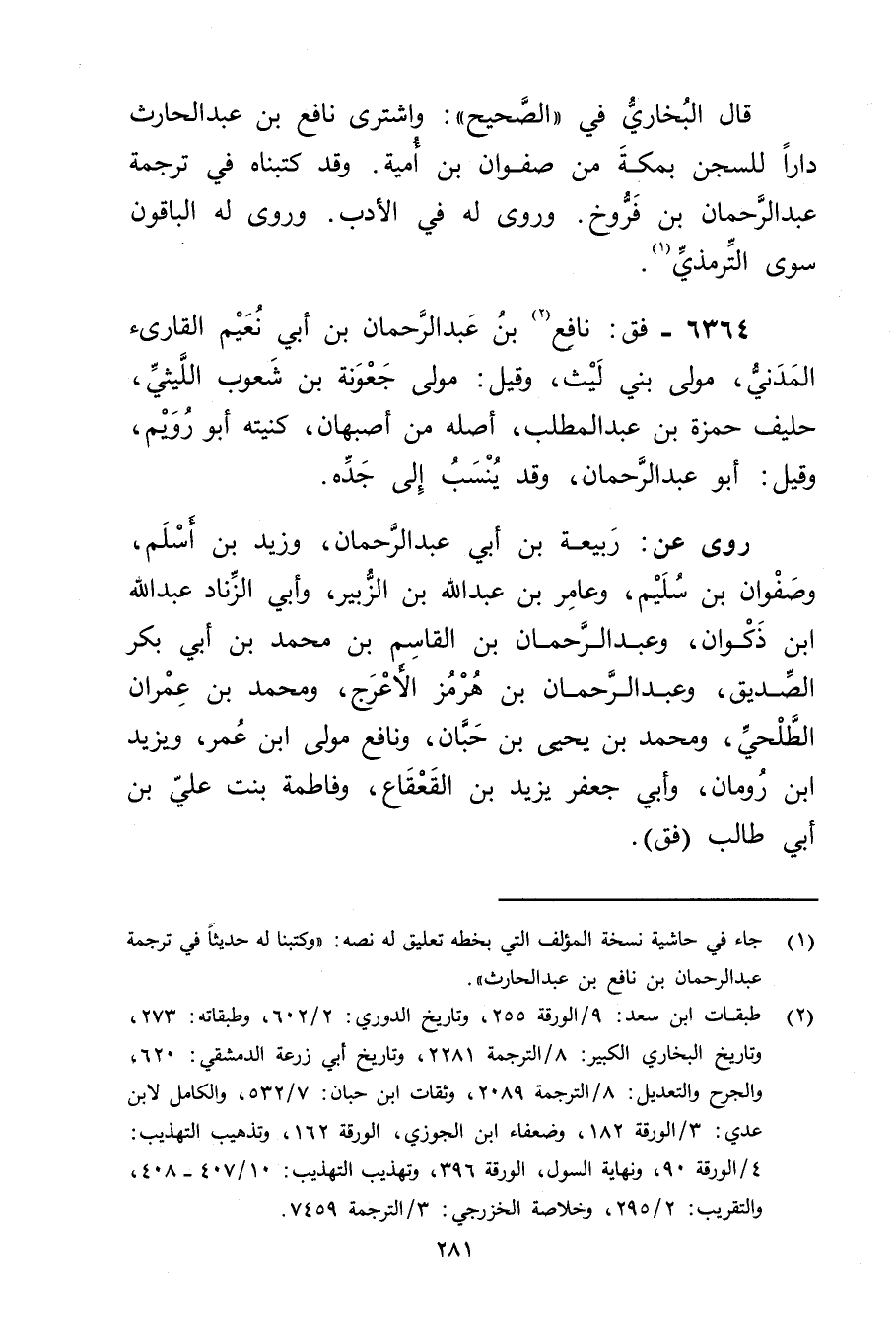 (1) جاء في حاشية نسخة المؤلف التي بخطه تعليق له نصه: وكتبنا له حديثًا فِي ترجمة عَبْد الرَّحْمَنِ بْن نافع بن عبد الحارث.