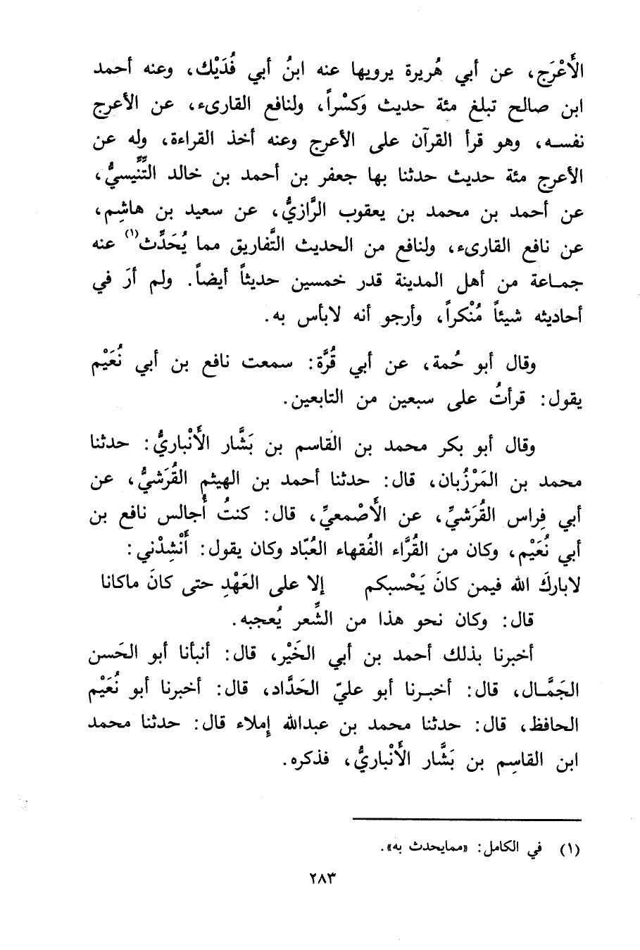 وَقَال أَبُو بكرٍ مُحَمَّدُ بْن الْقَاسِم بْن بشار الأَنْبارِيّ: حَدَّثَنَا مُحَمَّد بن المرزبان، قال: حَدَّثَنَا أَحْمَدُ بْنُ الهيثم القرشي، عَن أَبِي فراس القرشي، عن الأَصْمَعِيّ، قال: كنت أجالس نافع بن أَبي نعيم، وكَانَ من القراء الفقهاء العباد وكَانَ يَقُولُ: أنشدني: