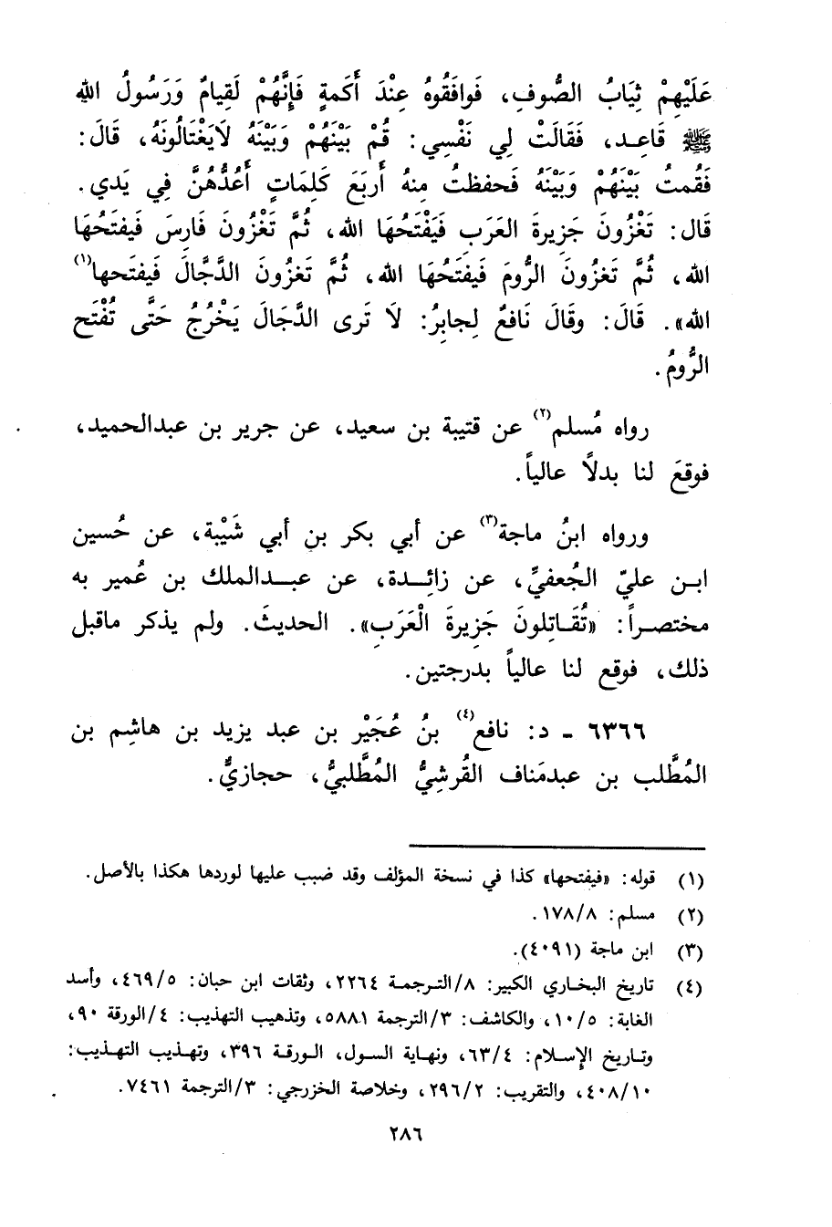 ورَوَاهُ ابن مَاجَهْ (3) عَن أبي بكر بْنِ أَبي شَيْبَة، عَنْ حُسَيْنِ ابن عَلِيٍّ الْجُعْفِيِّ، عَنْ زَائِدَةَ، عَنْ عَبد المَلِك بْنِ عُمَير بِهِ مُخْتَصَرًا: تُقَاتِلُونَ جَزِيرَةَ الْعَرَبِ". الْحَدِيثَ. ولَمْ يذكر مَا قبل ذَلِكَ، فوقع لنا عاليا بدرجتين.