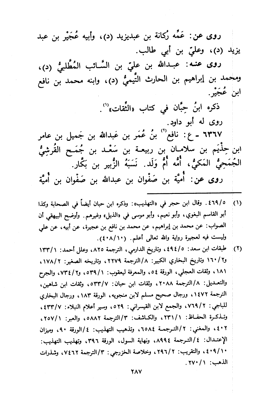 6367 - ع: نافع بن عُمَر بن عَبد اللَّهِ بن جميل بن عامر ابن حذيم بن سلامان بن ربيعة بن سَعْد بن جمح الْقُرَشِيّ الجمحي المكي (2) ، أمه أم ولد. نسبه الزبير بن بكار.