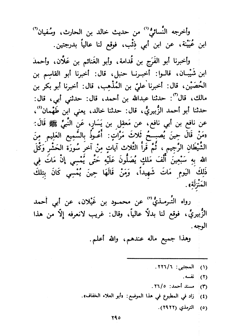 وأَخبرنا أَبُو الْفَرَجِ بْنُ قُدَامَةَ، وأَبُو الْغَنَائِمِ بْنُ عَلانَ، وأَحمد ابْنُ شيبان، قَالُوا: أَخبرنا حنبل، قال: أَخبرنا أبو القاسم بْن الحصين، قال: أَخبرنا عَلِيُّ بْنُ الْمُذْهِبِ، قال: أَخبرنا أبو بكر بْن مالك، قال (3) : حَدَّثَنَا عَبد الله بْن أَحْمَدَ، قال: حَدَّثني أبي، قال: حَدَّثَنَا أَبُو أَحْمَدَ الزُّبَيْرِيُّ، قال: حَدَّثَنَا خَالِدٌ، يَعْنِي ابْنَ طَهْمَانَ (4) ، عَنْ نَافِعِ بْنِ أَبي نَافِعٍ، عَنْ مَعْقِلِ بن يَسَارٍ، عَنِ النَّبِيِّ صلى الله عليه وسَلَّمَ قال: مَنْ قال حِينَ يُصْبِحُ ثَلاثَ مَرَّاتٍ: أَعُوذُ بِالسَّمِيعِ الْعَلِيمِ مِنَ الشَّيْطَانِ الرَّجِيمِ، ثُمَّ قَرَأَ الثَّلاثَ آيَاتٍ مِنْ آخِرِ سُورَةِ الْحَشْرِ وكَّلَ اللَّهُ بِهِ سَبْعِينَ أَلْفَ مَلَكٍ يُصَلُّونَ عَلَيْهِ حَتَّى يُمْسِي إِنْ مَاتَ فِي ذَلِكَ الْيَوْمِ مَاتَ شَهِيدًا، ومَنْ قَالَهَا حِينَ يُمْسِي كَانَ بِتِلْكَ الْمَنْزِلَةِ.