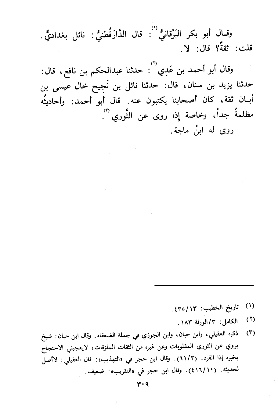 وَقَال أَبُو أَحْمَد بن عدي (2) : حَدَّثَنَا عبد الحكم بن نافع، قال: حَدَّثَنَا يزيد بن سنان، قال: حَدَّثَنَا نائل بن نجيح خال عِيسَى بن أبان ثقة، كَانَ أصحابنا يكتبون عَنْهُ. قال أَبُو أَحْمَد: وأحاديثه مظلمة جدا، وخاصة إِذَا روى عن الثوري (3) .