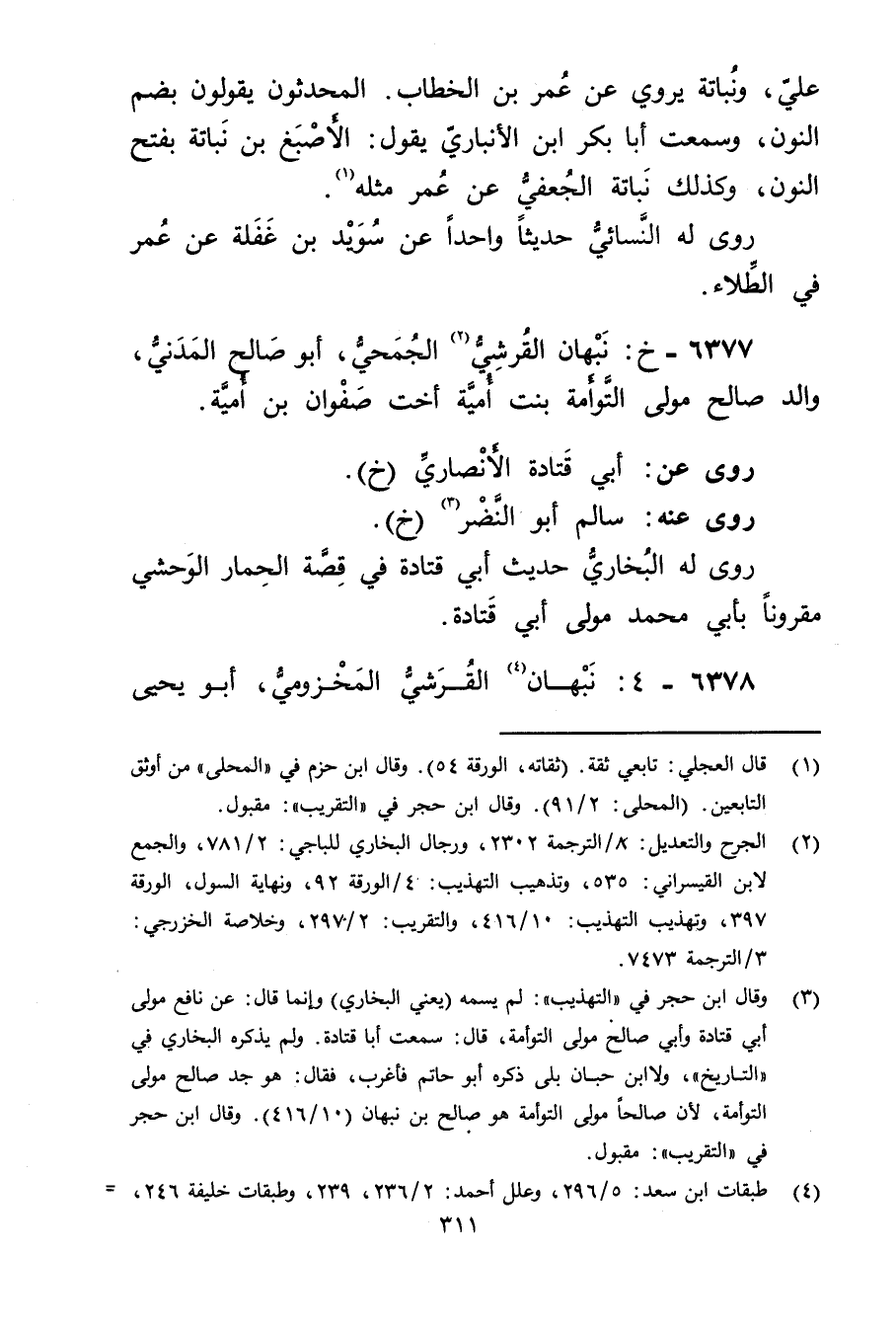 علي، ونباتة يروي عن عُمَر بن الخطاب. المحدثون يقولون بضم النون، وسمعت أبا بكر بن الأَنْبارِيّ يَقُولُ: الأصبغ بن نباتة بفتح النون، وكذلك نباتة الجعفي عن عُمَر مثله (1) .