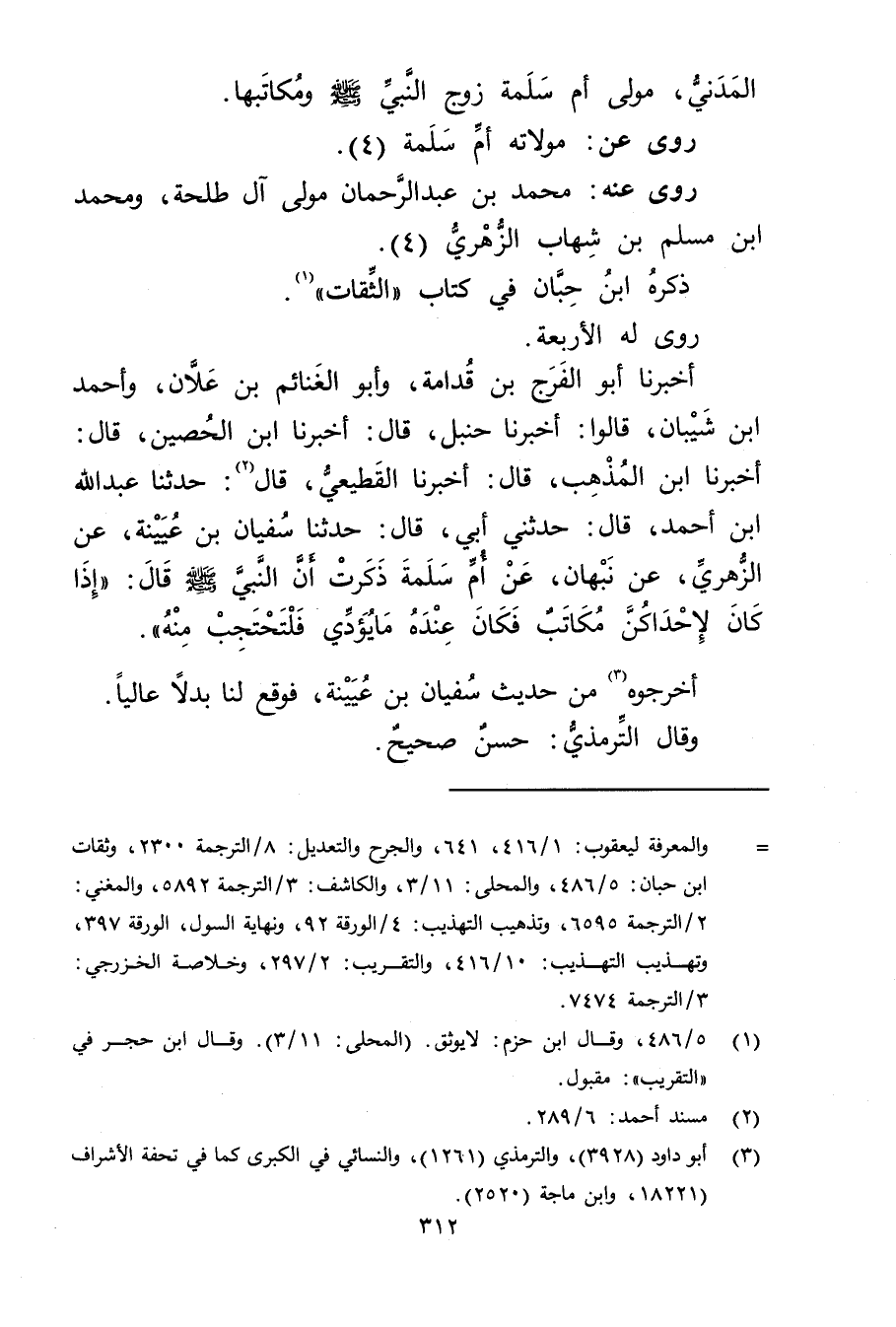 أَخبرنا أَبُو الْفَرَجِ بْنُ قُدَامَةَ، وأَبُو الْغَنَائِمِ بْنُ عَلانَ، وأَحمد ابْنُ شَيْبَانَ، قَالُوا: أَخبرنا حنبل، قال: أَخبرنا ابْنُ الْحُصَيْنِ، قال: أَخبرنا ابْنُ الْمُذْهِب، قال: أَخبرنا القَطِيعِيّ، قال (2) : حَدَّثَنَا عَبد اللَّهِ بْنُ أَحْمَدَ، قال: حَدَّثني أبي، قال: حَدَّثَنَا سفيان بْن عُيَيْنَة، عن الزُّهْرِيّ، عن نبهان، عن أم سلمة ذَكَرَتْ أَنَّ النَّبِيَّ صَلَّى اللَّهُ عَلَيْهِ وسَلَّمَ قال: إِذَا كَانَ لإِحْدَاكُنَّ مُكَاتِبٌ فَكَانَ عِنْدَهُ مَا يُؤَدِّي فَلْتَحْتَجِبْ مِنْهُ.
