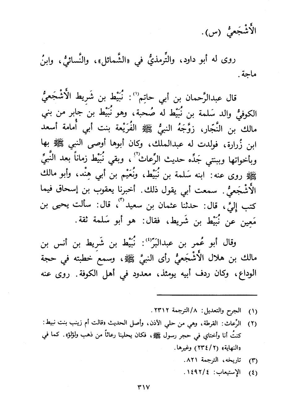 قال عَبْد الرَّحْمَنِ بن أَبي حاتم (1) : نبيط بن شريط الأشجعي الكوفي والد سلمة بن نبيط لهُ صُحبَةٌ، وهُوَ نبيط بن جابر من بني مالك بن النجار، زوجه النبي صَلَّى اللَّهُ عليه وسلم الفريعة بنت أبي أمامة أسعد ابن زرارة، فولدت لَهُ عَبد المَلِك، وكَانَ أبوها أوصى النبي صَلَّى اللَّهُ عليه وسلم بها وبأخواتها وببنتي جده حديث الرعاث (2) ، وبقي نبيط زمانا بعد النبي صَلَّى اللَّهُ عَلَيْهِ وسَلَّمَ رَوَى عَنه: ابنه سلمة بن نبيط، ونعيم بن أَبي هند، وأَبُو مالك الأشجعي. سمعت أبي يقول ذلك. أَخبرنا يعقوب بْن إسحاق فيما كتب إلي، قال: حَدَّثَنَا عثمان بْن سَعِيد (3) ، قال: سألت يحيى بن مَعِين عن نبيط بن شريط، فَقَالَ: هو أَبُو سلمة ثقة.
