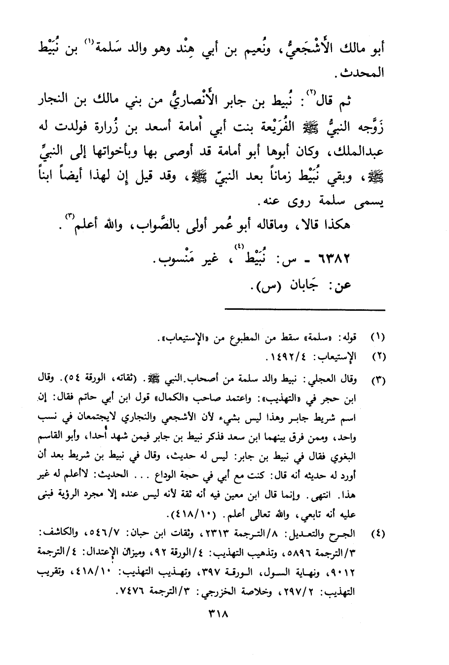 (3) وَقَال العجلي: نبيط والد سلمة من أصحاب النَّبِيّ صَلَّى اللَّهُ عليه وسلم. (ثقاته، الورقة 54) . وَقَال ابن حجر في " التهذيب": واعتمد صاحب" الكمال" قول ابن أَبي حاتم فقال: ان اسم شريط جابر وهذا ليس بشيءٍ لان الاشجعي والنجاري لا يجتمعان في نسب واحد، وممن فرق بينهما ابن سعد فذكر نبيط بن جابر فيمن شهد احدا، وابو القاسم البغوي فقال في نبيط بن جابر: ليس له حديث، وَقَال في نبيط بن شريط بعد ان أورد له حديثه انه قال: كنت مع أبي في حجة الوداع ... الحديث: لا أعلم له غير هذا. انتهى. وانما قال ابن مَعِين فيه انه ثقة لانه ليس عنده الا مجرد الرؤية فبنى عليه انه تابعي، والله تعالى اعلم. (10 / 418) .