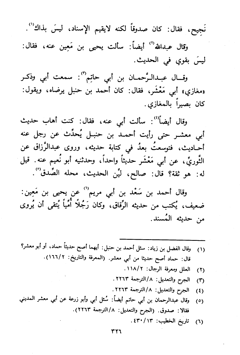 (5) وَقَال عَبْد الرَّحْمَنِ بْن أَبي حاتم ايضا: سئل أبي وابو زرعة عَن أبي معشر المديني فقالا: صدوق. (الجرح والتعديل: 8 / الترجمة 2263) .