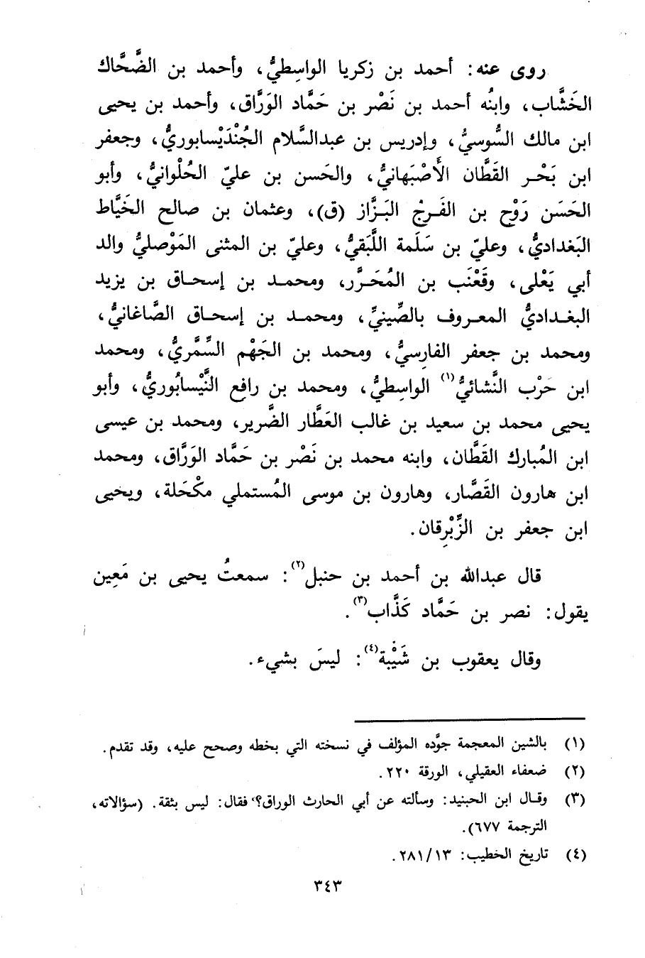 قال عَبد اللَّهِ بْن أَحْمَد بْن حنبل (2) : سمعت يحيى بْن مَعِين يَقُول: نصر بن حماد كذاب (3) .