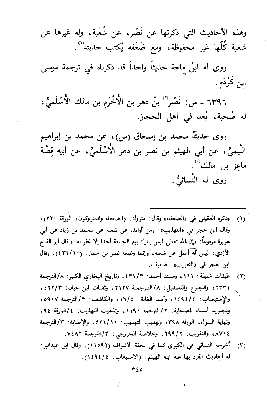 6396 - س: نصر بن دهر بن الأخرم بن مالك الأَسلميّ (2) ، لهُ صُحبَةٌ، يعد فِي أهل الحجاز.