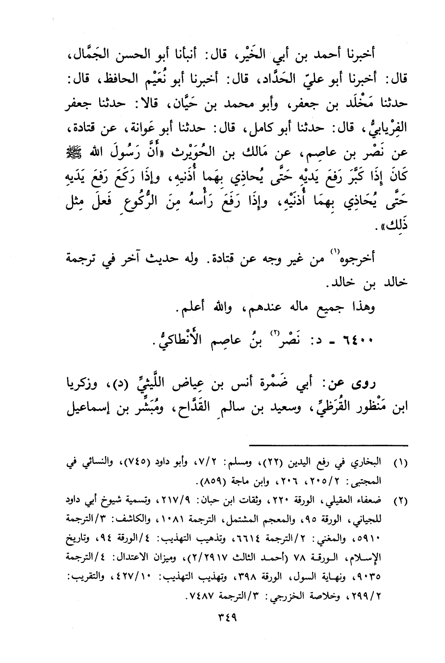 أَخبرنا أَحْمَد بْن أَبي الخير، قال: أَنْبَأَنَا أَبُو الْحَسَنِ الْجَمَّالُ، قال: أَخبرنا أَبُو عَلِيّ الحداد، قال: أَخبرنا أَبُو نُعَيْمٍ الْحَافِظُ، قال: حَدَّثَنَا مَخْلَدُ بْنُ جَعْفَرٍ، وأَبُو مُحَمَّدِ بْنُ حَيَّانَ، قَالا: حَدَّثَنَا جَعْفَر الفريابي، قال: حَدَّثَنَا أَبُو كَامِلٍ، قال: حَدَّثَنَا أَبُو عَوَانَةَ، عَنْ قَتَادَةَ، عَنْ نَصْرِ بْنِ عَاصِمٍ، عَنْ مَالِكِ بْنِ الْحُوَيْرِثِ" أَنَّ رَسُولَ اللَّهِ صَلَّى اللَّهُ عَلَيْهِ وسَلَّمَ كَانَ إِذَا كَبَّرَ رَفَعَ يَدَيْهِ حَتَّى يُحَاذِيَ بِهِمَا أُذُنَيْهِ، وإِذَا رَكَعَ رَفَعَ يَدَيْهِ حَتَّى يُحَاذِيَ بِهِمَا أُذُنَيْهِ، وإِذَا رَفَعَ رَأْسَهُ مِنَ الرُّكُوعِ فَعَلَ مِثْلَ ذَلِكَ.