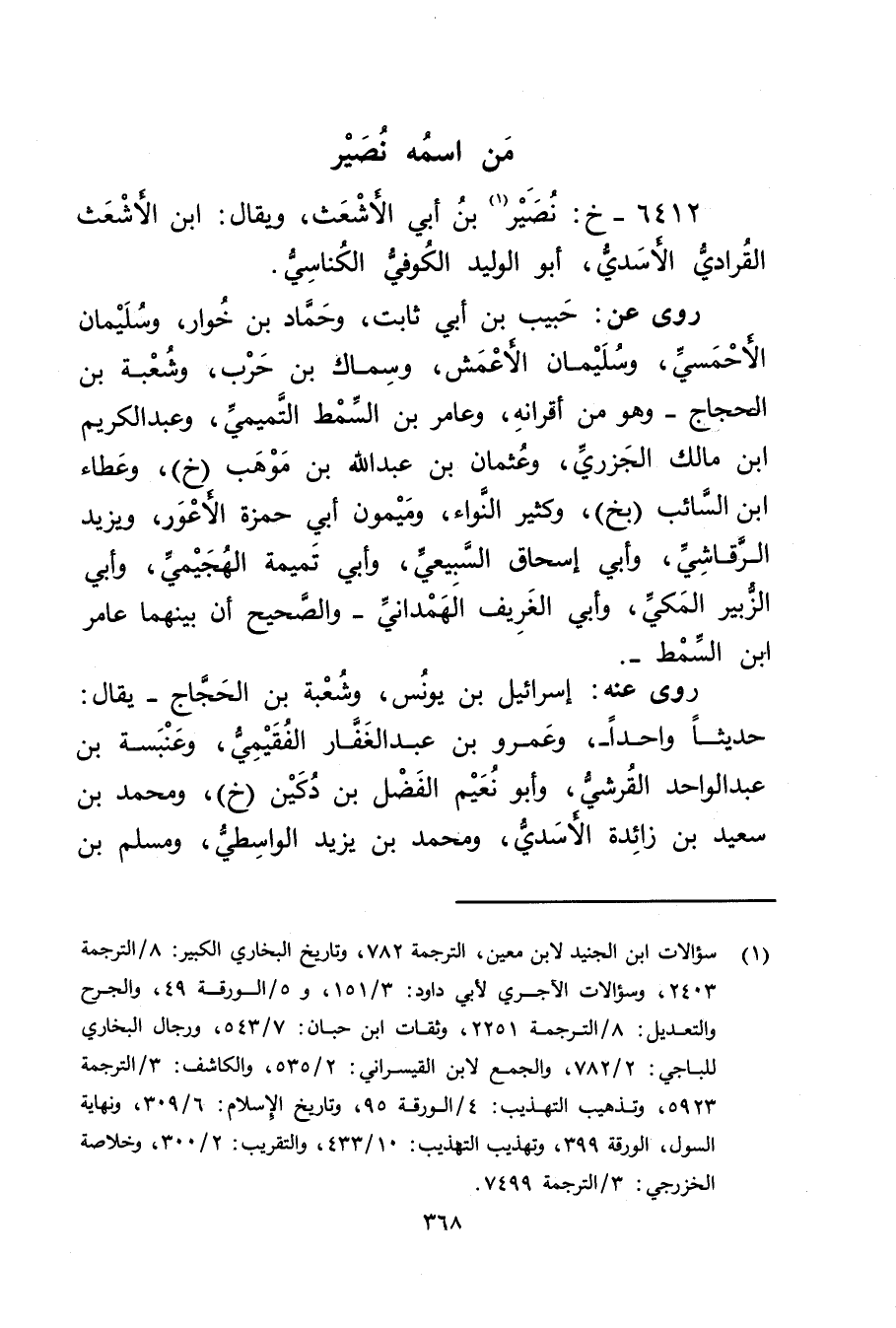 6412 - خ: نصير بن أَبي الأشعث (1) ، ويُقال: ابن الأشعث القرادي الأسدي، أَبُو الوليد الكوفي الكناسي.