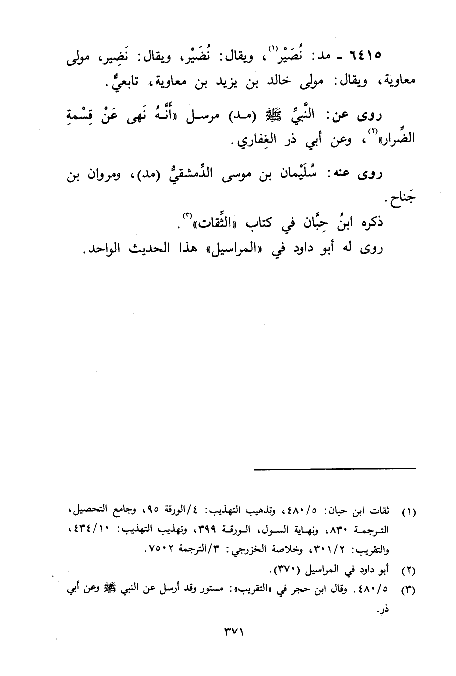 6415 - مد: نصير (1) ، ويُقال: نضير، ويُقال: نضير، مولى معاوية، ويُقال: مولى خَالِد بْن يزيد بْن مُعَاوِيَة، تابعي.