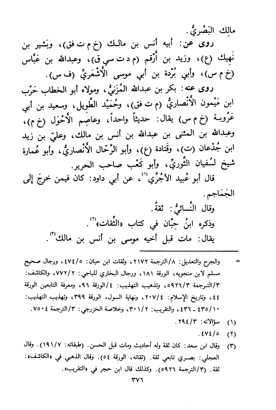 = والجرح والتعديل: 8 / الترجمة 2172، وثقات ابن حبان: 5 / 474، ورجال صحيح مسلم لابن منجويه، الورقة 181، ورجال البخاري للباجي: 2 / 772، والكاشف: 3 / الترجمة 3 / 5926، وتذهيب التهذيب: 4 / الورقة 96، ومعرفة التابعين الورقة 44، وتاريخ الاسلام: 4 / 207، ونهاية السول، الورقة 399، وتهذيب التهذيب: 10 / 435 - 436، والتقريب: 2 / 301، وخلاصة الخزرجي: 3 / الترجمة 7504.