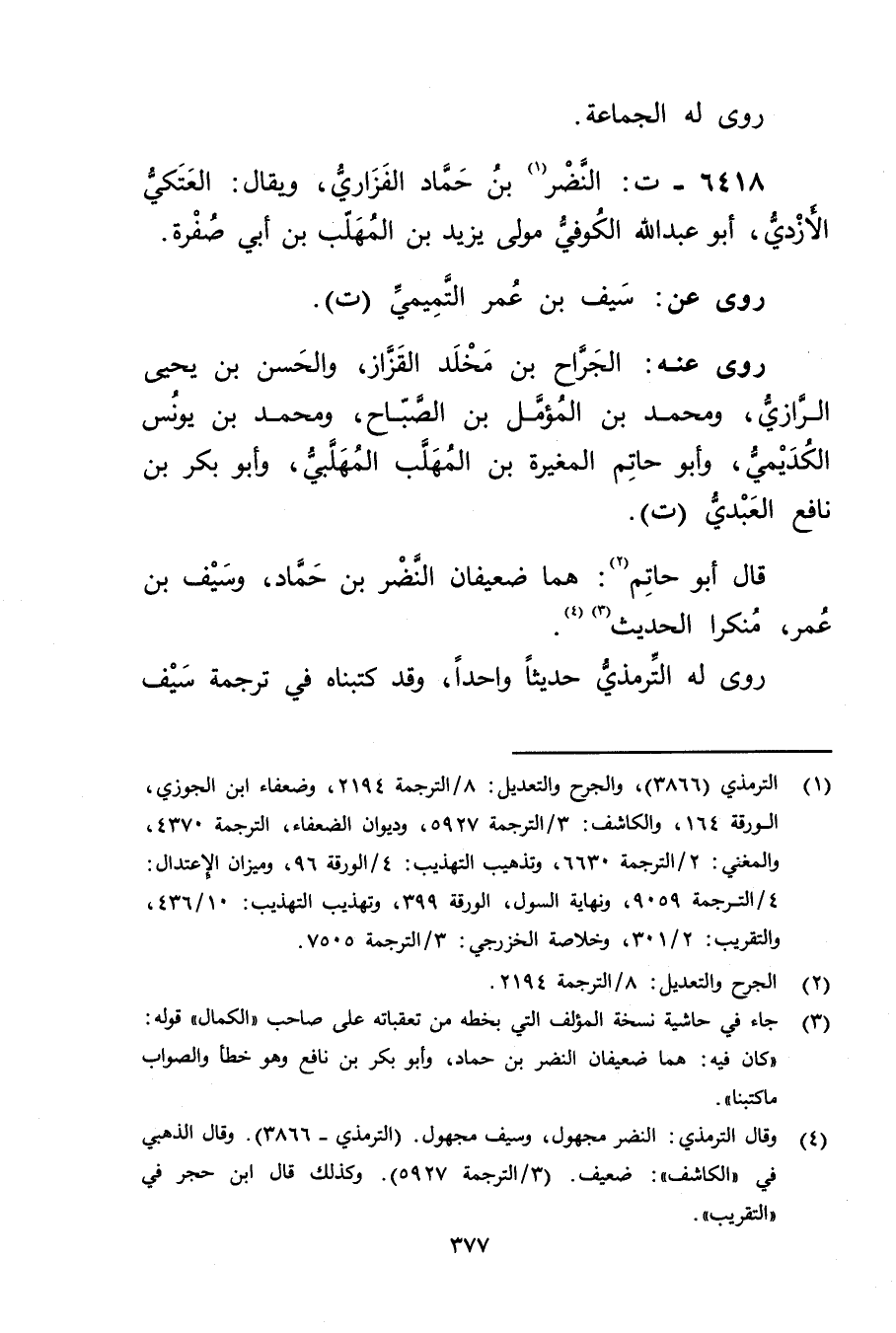 (4) وَقَال التِّرْمِذِيّ: النضر مجهول، وسيف مجهول. (التِّرْمِذِيّ - 3866) . وَقَال الذهبي في " الكاشف": ضعيف. (3 / الترجمة 5927) . وكذلك قال ابن حجر في "التقريب".