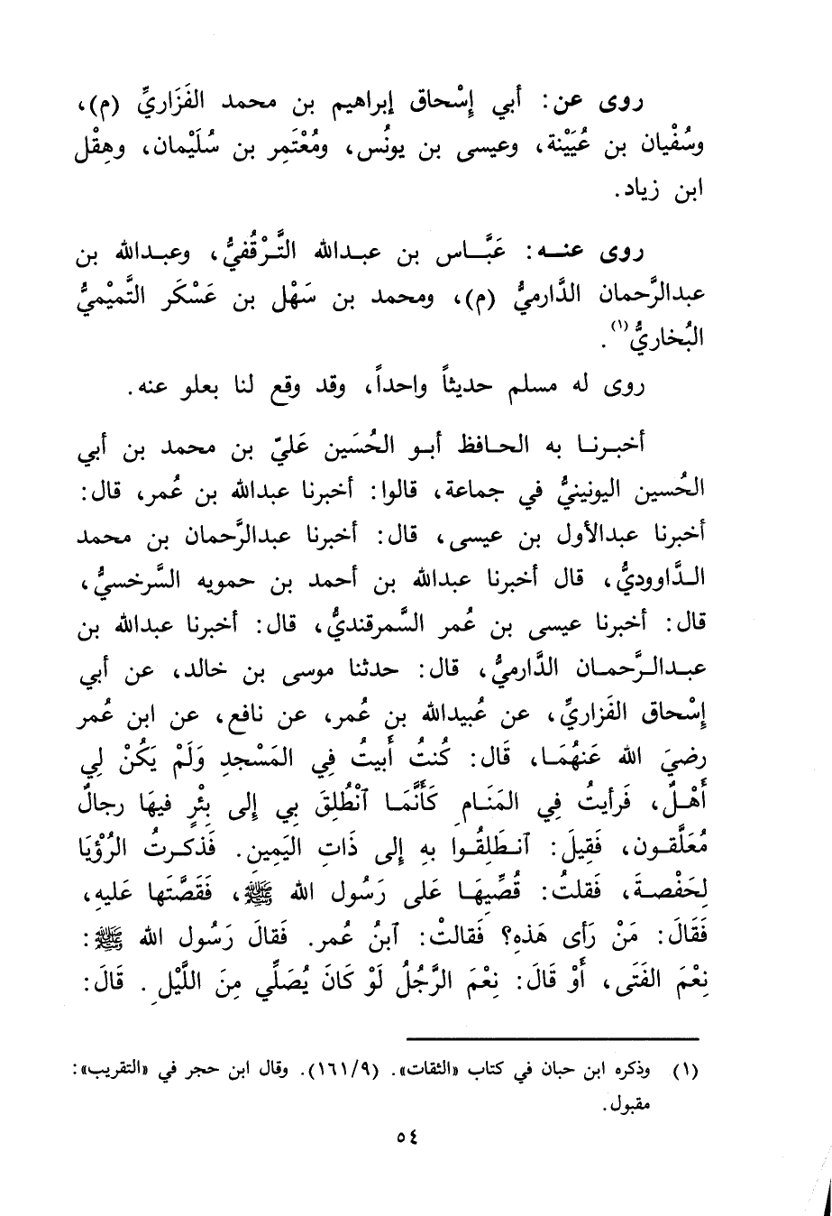 أَخبرنا بِهِ الْحَافِظُ أَبُو الْحُسَيْنِ عَلِيّ بْن مُحَمَّدِ بْنِ أَبي الْحُسَيْنِ الْيُونِينِيُّ فِي جَمَاعَةٍ، قَالُوا: أَخبرنا عَبد اللَّهِ بن عُمَر، قال: أَخبرنا عبد الأَوَّلِ بْنُ عِيسَى، قال: أَخبرنا عَبْدُ الرَّحْمَنِ بْنُ مُحَمَّدٍ الدَّاوُودِيُّ، قال أَخبرنا عَبد الله بْن أَحْمَدَ بْنِ حَمَّوَيْهِ السَّرَخْسِيُّ، قال: أَخبرنا عِيسَى بْنُ عُمَر السَّمَرْقَنْدِيُّ، قال: أَخبرنا عَبْد الله بْن عَبْدِ الرَّحْمَنِ الدَّارِمِيُّ، قال: حَدَّثَنَا مُوسَى بْنُ خَالِدٍ، عَن أَبِي إِسْحَاقَ الْفَزَارِيِّ، عَنْ عُبَيد اللَّهِ بْنِ عُمَر، عن نَافِعٍ، عن ابْنِ عُمَر رَضِيَ اللَّهُ عَنْهُمَا، قال: كُنْتُ أَبِيتُ فِي الْمَسْجِدِ ولَمْ يَكُنْ لِي أَهْلٌ، فَرَأَيْتُ فِي الْمَنَامِ كَأَنَّمَا انْطُلِقَ بِي إِلَى بِئْرٍ فِيهَا رِجَالٌ مُعَلَّقُونَ، فَقِيلَ: انْطَلِقُوا بِهِ إِلَى ذَاتِ الْيَمِينِ. فَذَكَرْتُ الرُّؤْيَا لِحَفْصَةَ، فَقُلْتُ: قُصِّيهَا عَلَى رَسُولِ اللَّهِ صَلَّى اللَّهُ عَلَيْهِ وسَلَّمَ، فَقَصَّتْهَا عَلَيْهِ، فَقَالَ: مَنْ رَأَى هَذِهِ؟ فَقَالَتِ: ابْنُ عُمَر. فَقَالَ رَسُولُ اللَّهِ صَلَّى اللَّهُ عَلَيْهِ وسَلَّمَ: نِعْمَ الْفَتَى، أَوْ قال: نِعْمَ الرَّجُلُ لَوْ كَانَ يُصَلِّي مِنَ اللَّيْلِ. قال: