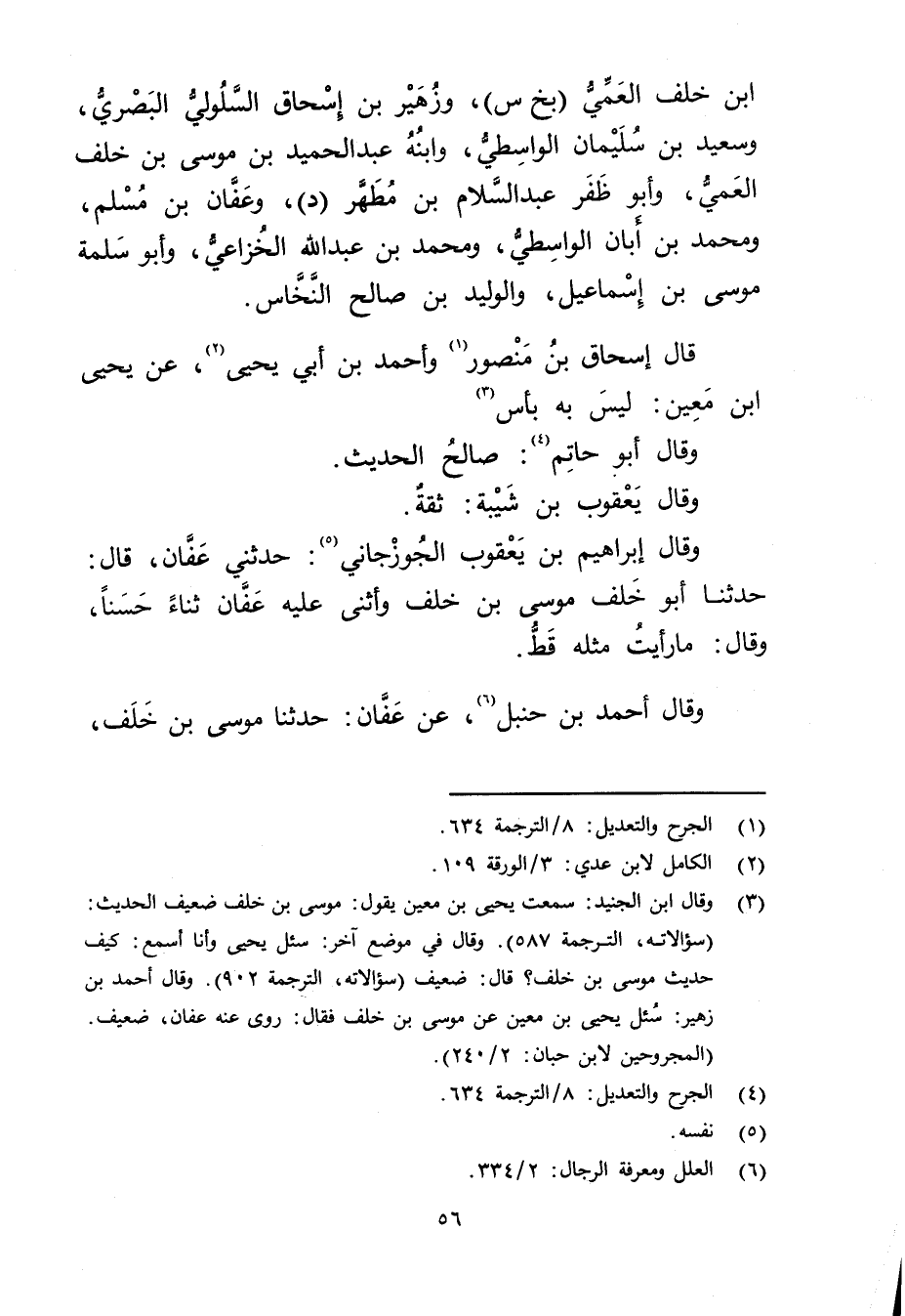 (3) وَقَال ابن الجنيد: سمعت يَحْيَى بن مَعِين يقول: موسى بن خلف ضعيف الحديث: (سؤالاته، الترجمة 587) . وَقَال فِي موضع آخر: سئل يحيى وانا اسمع: كيف حديث موسى بن خلف؟ قال: ضعيف (سؤالاته، الترجمة 902) . وَقَال أحمد بن زهير: سئل يحيى بْن مَعِين عَن موسى بن خلف فقال: روى عنه عفان، ضعيف. (المجروحين لابن حبان: 2 / 240) .