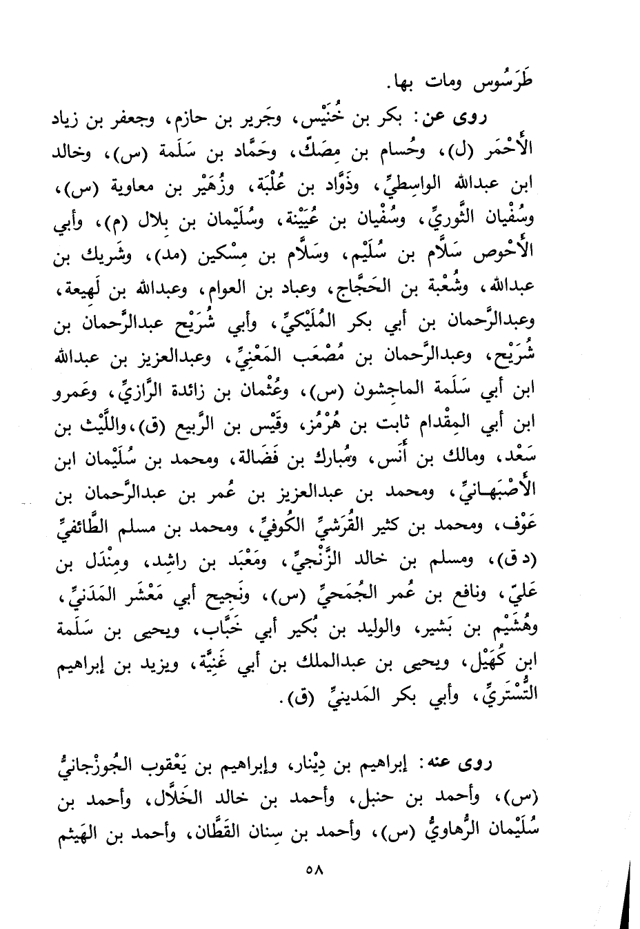 رَوَى عَن: بكر بْن خنيس، وجرير بْن حازم، وجعفر بن زياد الأحمر (ل) ، وحسام بن مصك، وحماد بْن سلمة (س) ، وخالد بْن عَبد اللَّهِ الواسطي، وذواد بن علبة، وزهير بن معاوية (س) ، وسفيان الثوري، وسفيان بْن عُيَيْنَة، وسُلَيْمان بن بلال (م) ، وأبي الأَحوص سلام بْن سليم، وسلام بن مسكين (مد) ، وشَرِيك بن عَبد الله، وشعبة بْن الحجاج، وعباد بْن العوام، وعَبد الله بْن لَهِيعَة، وعبد الرحمن بْن أَبي بكر المليكي، وأبي شريح عَبْد الرَّحْمَنِ بْن شريح، وعبد الرحمن بن مصعب المعني، وعبد العزيز بْن عَبد اللَّهِ بْن أَبي سلمة الماجشون (س) ، وعُثْمَان بن زائدة الرازي، وعَمْرو ابن أَبي المقدام ثَابِت بْن هرمز، وقيس بن الربيع (ق) ، والليث بْن سعد، ومالك بْن أنس، ومبارك بْن فضالة، ومحمد بْن سُلَيْمان ابن الأصبهاني، ومحمد بن عَبْدِ العَزِيزِ بْن عُمَر بْن عَبْد الرَّحْمَنِ بن عوف، ومحمد بن كثير القرشي الكوفي، ومحمد بن مسلم الطائفي (دق) ، ومسلم بن خالد الزنجي، ومعبد بن راشد، ومندل بن علي، ونافع بْن عُمَر الجمحي (س) ، ونجيح أبي معشر المدني، وهشيم بن بشير، والوليد بن بكير أبي خباب، ويحيى بن سلمة ابن كهيل، ويحيى بن عَبْد الْمَلِكِ بْن أَبي غنية، ويزيد بْن إِبْرَاهِيمَ التستري، وأبي بكر المديني (ق) .