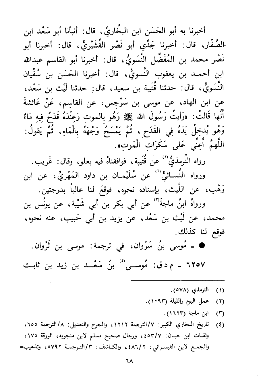 أَخبرنا بِهِ أَبُو الْحَسَنِ بْنُ الْبُخَارِيّ، قال: أنبأنا أَبُو سعد ابن الصَّفَّارِ، قال: أَخبرنا جَدِّي أَبُو نَصْرٍ الْقُشَيْرِيُّ، قال: أَخبرنا أَبُو نَصْرٍ مُحَمَّدُ بْنُ الْمُفَضَّلِ النَّسَوِيُّ، قال: أَخبرنا أبو القاسم عَبد اللَّهِ بْنُ أَحْمَدَ بْنِ يَعْقُوبَ النَّسَوِيُّ، قال: أَخبرنا الْحَسَنُ بْنُ سُفْيَانَ النَّسَوِيُّ، قال: حَدَّثَنَا قُتَيْبَةُ بْنُ سَعِيد، قال: حَدَّثَنَا لَيْثُ بْن سعد، عَنِ ابْن الهاد، عَنْ موسى بْن سرجس، عَنْ الْقَاسِمِ، عَنْ عَائِشَةَ أَنَّهَا قَالَتْ: رأيت رَسُول اللَّهِ صلى الله عَلَيْهِ وسَلَّمَ وهُوَ بِالْمَوْتِ وعِنْدَهُ قَدَحٌ فِيهِ مَاءٌ وهُوَ يُدْخِلُ يَدَهُ فِي الْقَدَحِ، ثُمَّ يَمْسَحُ وجْهَهُ بِالْمَاءِ، ثُمَّ يَقُولُ: اللَّهُمَّ أَعِنِّي عَلَى سَكَرَاتِ الْمَوْتِ.