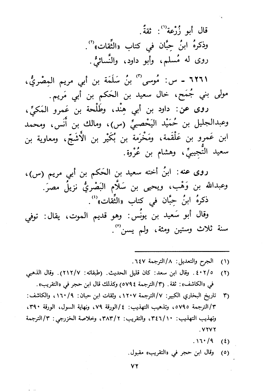 6261 - س: مُوسَى بن سلمة بن أَبي مريم المِصْرِي (3) ، مولى بني جمح، خال سَعِيد بن الحكم بن أَبي مريم.