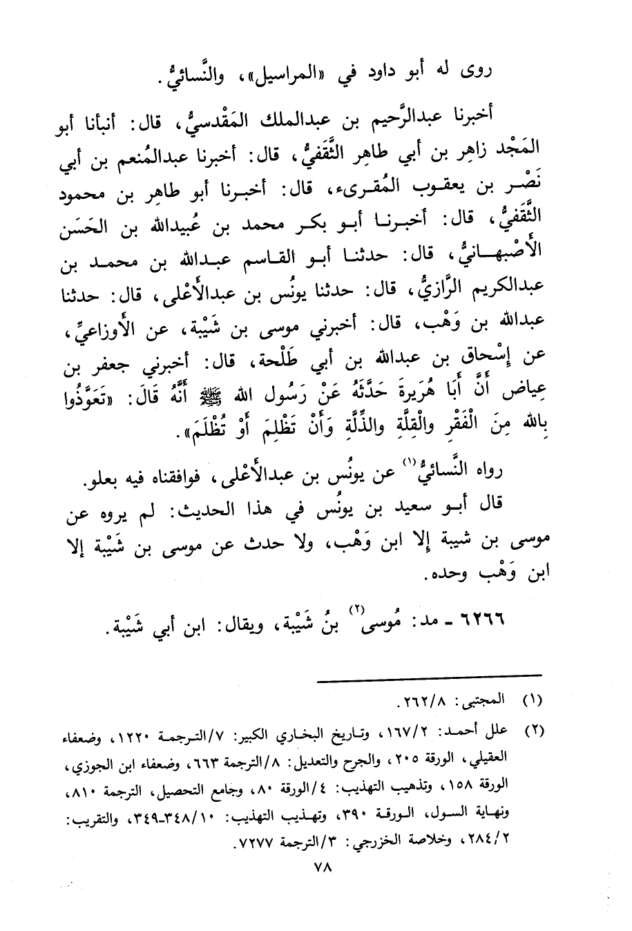 أَخبرنا عَبد الرَّحِيمِ بْنُ عَبد المَلِك الْمَقْدِسِيُّ، قال: أنبأنا أَبُو الْمَجْدِ زَاهِرُ بْنُ أَبي طَاهِرٍ الثَّقَفِيُّ، قال: أَخبرنا عَبْدُ الْمُنْعِمِ بْنُ أَبي نَصْرِ بْنِ يَعْقُوبَ الْمُقْرِئُ، قال: أَخبرنا أَبُو طاهر بْن محمود الثقفي، قال: أَخبرنا أَبُو بكر مُحَمَّد بْنُ عُبَيد اللَّهِ بْنِ الْحَسَنِ الأَصْبَهَانِيُّ، قال: حَدَّثَنَا أَبُو الْقَاسِمِ عَبد اللَّهِ بْن مُحَمَّد بْن عَبْدِ الْكَرِيمِ الرَّازِيُّ، قال: حَدَّثَنَا يُونُسُ بْنُ عَبْدِ الأَعْلَى، قال: حَدَّثَنَا عَبد اللَّهِ بْن وهب، قال: أَخْبَرَنِي مُوسَى بْنُ شَيْبَة، عَنِ الأَوزاعِيّ، عَنْ إِسْحَاقَ بْنِ عَبد الله بْن أَبي طلحة، قال: أَخْبَرَنِي جَعْفَرُ بْنُ عِيَاضٍ أَنَّ أَبَا هُرَيْرة حَدَّثَهُ عَنْ رَسُول اللَّهِ صلى الله عليه وسَلَّمَ أَنَّهُ قال: تَعَوَّذُوا بِاللَّهِ مِنَ الْفَقْرِ والْقِلَّةِ والذِّلَّةِ وأَنْ تَظْلِمُ أَوْ تُظْلَمَ.