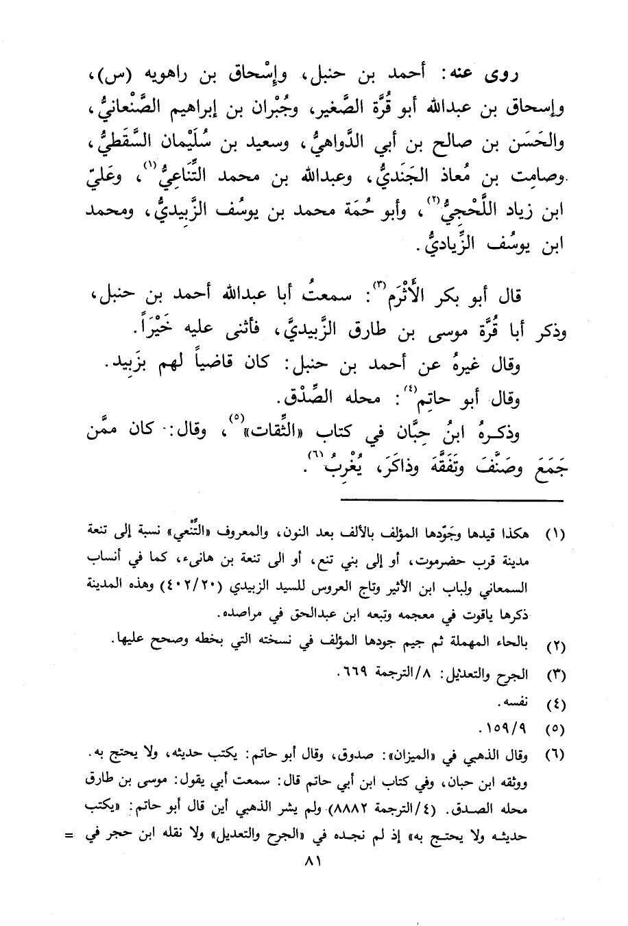 (6) وَقَال الذهبي في " الميزان": صدوق، وَقَال أَبُو حاتم: يكتب حديثه، ولا يحتج به. ووثقه ابن حبان، وفي كتاب ابْنُ أَبي حَاتِمٍ قال: سَمِعْتُ أبي يقول: موسى بن طارق محله الصدق. (4 / الترجمة 8882) ولم يشر الذهبي اين قال أبو حاتم: يكتب حديثه ولا يحتج به" إذ لم نجده في " الجرح والتعديل" ولا نقله ابن حجر في =