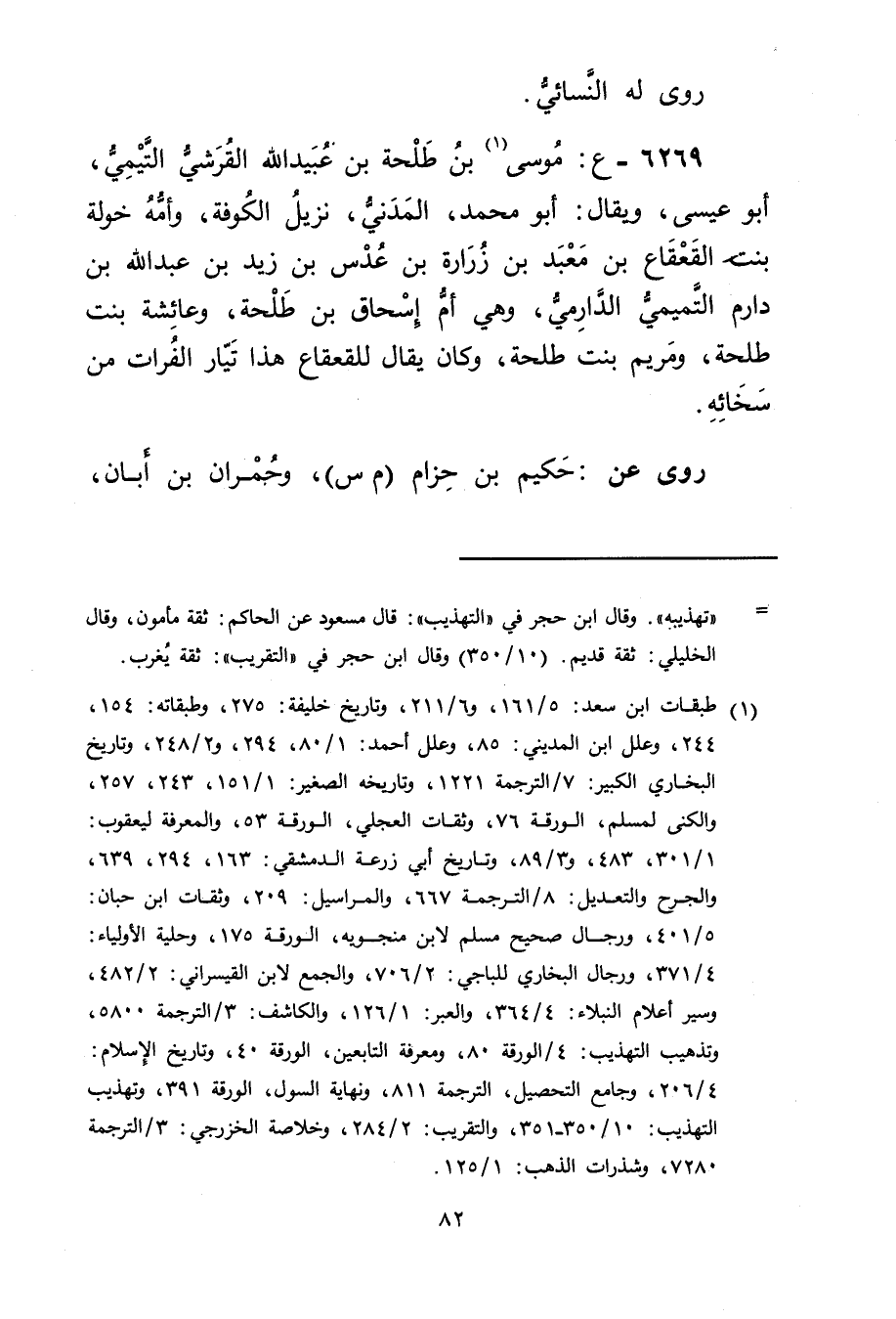 6269 - ع: مُوسَى بْن طلحة بْن عُبَيد الله القرشي التَّيْمِيّ (1) ، أَبُو عِيسَى، ويُقال: أَبُو مُحَمَّد، المدني، نزيل الكوفة، وأمه خولة بنت القعقاع بن معبد بن زرارة بن عدس بن زَيْد بن عَبد اللَّهِ بْنِ دارم التميمي الدارمي، وهي أم إسحاق بن طلحة، وعائشة بنت طلحة، ومريم بنت طلحة، وكَانَ يقال للقعقاع هَذَا تيار الفرات من سخائه.