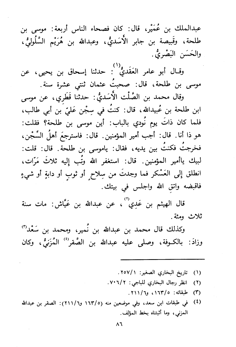 وَقَال مُحَمَّد بْن الصلت الأسدي: حَدَّثَنَا قطري، عن موسى ابن طلحة بْن عُبَيد اللَّه، قال: كنت فِي سجن علي بن أَبي طالب، فلما كَانَ ذات يوم نودي بالباب: أين مُوسَى بن طلحة؟ فقلت: هو ذا أنا. قال: أجب أمير المؤمنين. قال: فاسترجع أهل السجن، فخرجت فكنت بين يديه، فَقَالَ: يا مُوسَى بن طلحة. قال: قلت: لبيك يا أمير المؤمنين. قال: استغفر الله وتب إليه ثلاث مرات، انطلق إِلَى العسكر فما وجدت من سلاح أو ثوب أو دابة أو شيء فاقبضه واتق الله واجلس فِي بيتك.