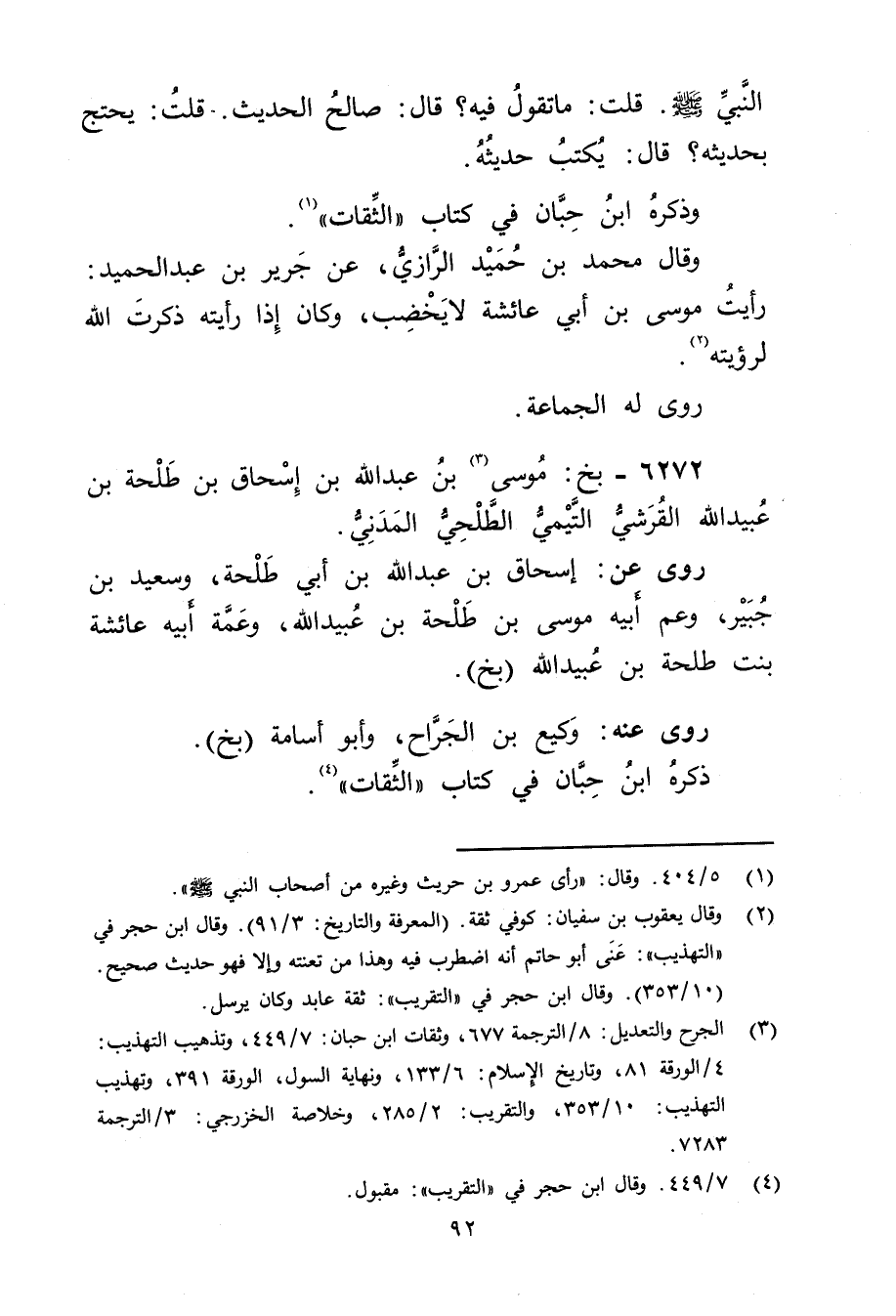 (3) الجرح والتعديل: 8 / الترجمة 677، وثقات ابن حبان: 7 / 449، وتذهيب التهذيب: 4 / الورقة 81، وتاريخ الاسلام: 6 / 133، ونهاية السول، الورقة 391، وتهذيب التهذيب: 10 / 353، والتقريب: 2 / 285، وخلاصة الخزرجي: 3 / الترجمة 7283.