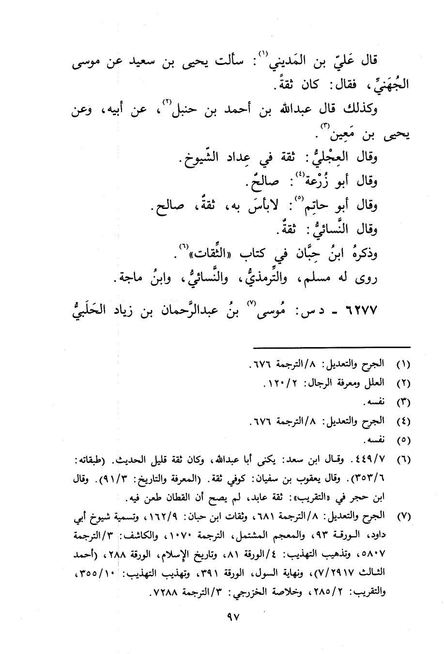 (7) الجرح والتعديل: 8 / الترجمة 681، وثقات ابن حبان: 9 / 162، وتسمية شيوخ أبي داود، الورقة 93، والمعجم المشتمل، الترجمة 1070، والكاشف: 3 / الترجمة 5807، وتذهيب التهذيب: 4 / الورقة 81، وتاريخ الاسلام، الورقة 288، (أحمد الثالث 2917 / 7) ، ونهاية السول، الورقة 391، وتهذيب التهذيب: 10 / 355، والتقريب: 2 / 285، وخلاصة الخزرجي: 3 / الترجمة 7288.