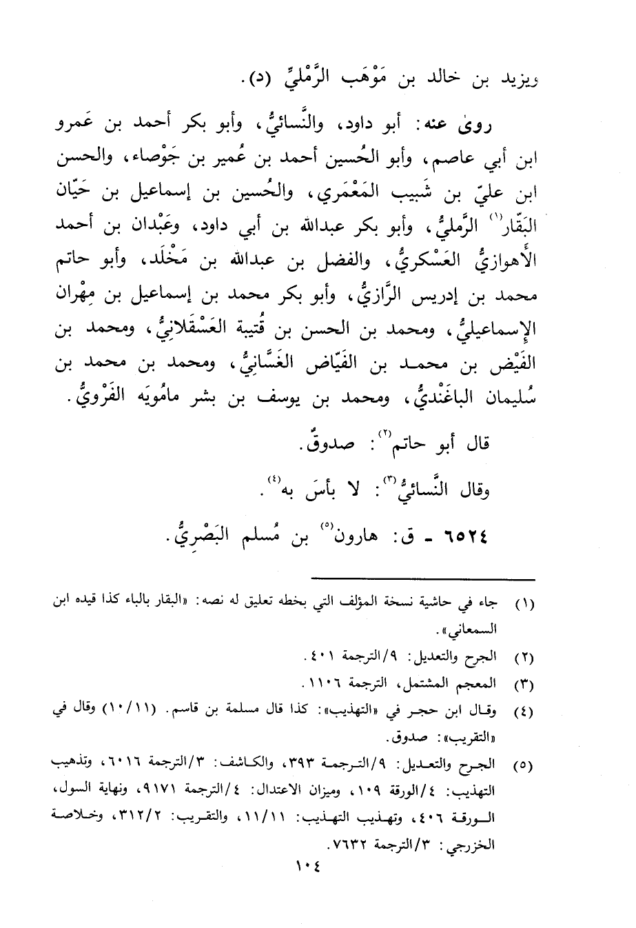 (5) الجرح والتعديل: 9 / الترجمة 393، والكاشف: 3 / الترجمة 6061، وتذهيب التهذيب: 4 / الورقة 109، وميزان الاعتدال: 4 / الترجمة 9171، ونهاية السول، الورقة 406، وتهذيب التهذيب: 11 / 11، والتقريب: 2 / 312، وخلاصة الخزرجي: 3 / الترجمة 7632.