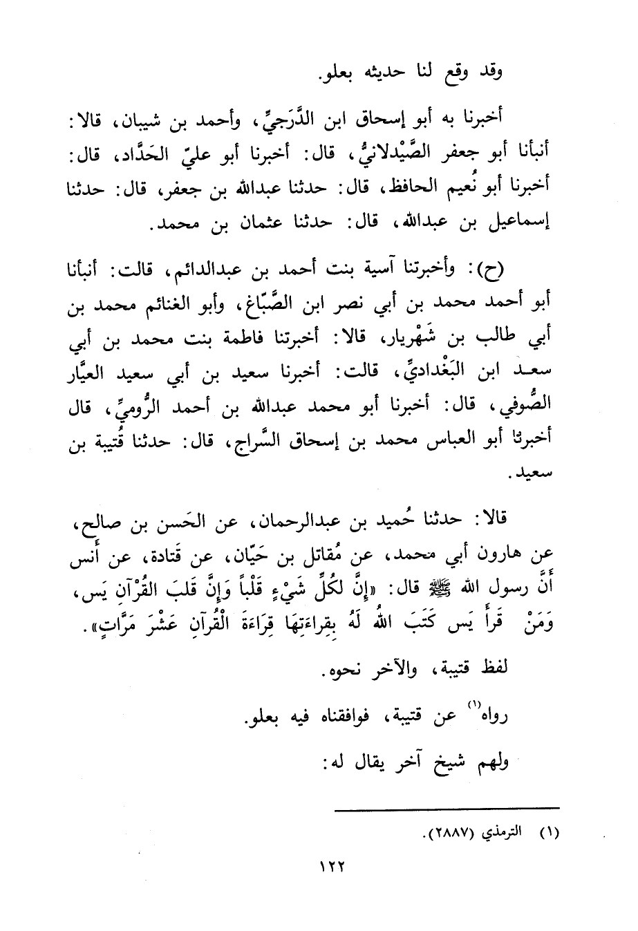 (ح) : وأَخْبَرَتْنَا آسِيَةُ بِنْتُ أَحْمَدَ بْنِ عَبْدِ الدَّائِمِ، قَالَتْ: أَنْبَأَنَا أَبُو أحمد مُحَمَّد بْن أَبي نصر ابن الصَّبَّاغِ، وأَبُو الْغَنَائِمِ مُحَمَّدُ بْنُ أَبي طَالِبِ بْنِ شَهْرَيَارَ، قَالا: أَخْبَرَتْنَا فاطمة بِنْتُ مُحَمَّدِ بْنِ أَبي سعد ابن الْبَغْدَادِيِّ، قَالَتْ: أَخْبَرَنَا سَعِيد بْنُ أَبي سَعِيد الْعَيَّارُ الصُّوفِيُّ، قال: أَخْبَرَنَا أبو مُحَمَّد عَبد الله بْنُ أَحْمَدَ الرُّومِيُّ، قال: أَخْبَرَنَا أَبُو الْعَبَّاسِ مُحَمَّدُ بْنُ إِسْحَاقَ السَّرَّاجُ، قال: حَدَّثَنَا قُتَيْبَةُ بْنُ سَعِيد.