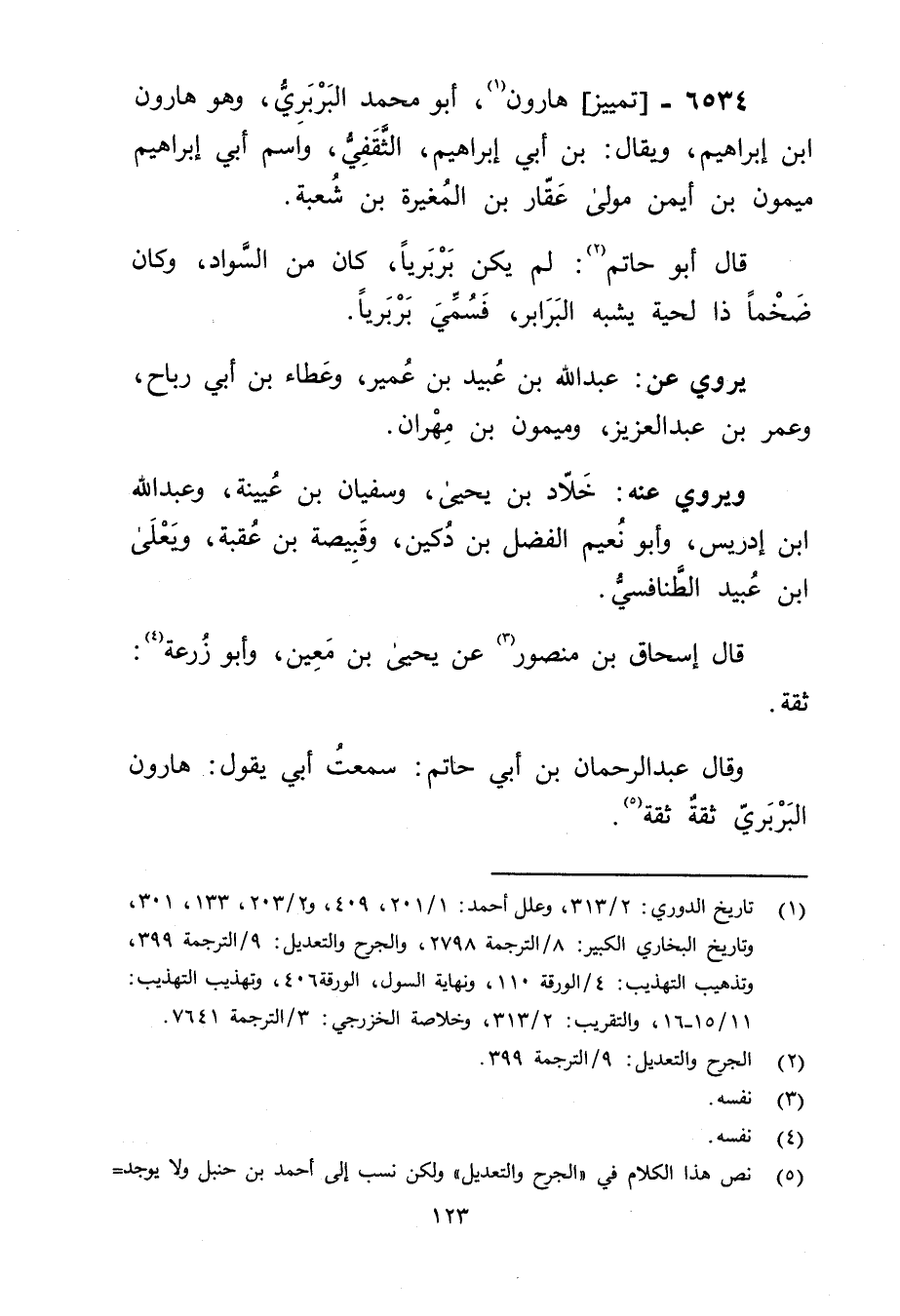 وَقَال عبد الرَّحْمَنِ بْن أَبي حَاتِم: سمعت أبي يقول: هارون البربري ثقة ثقة (5) .