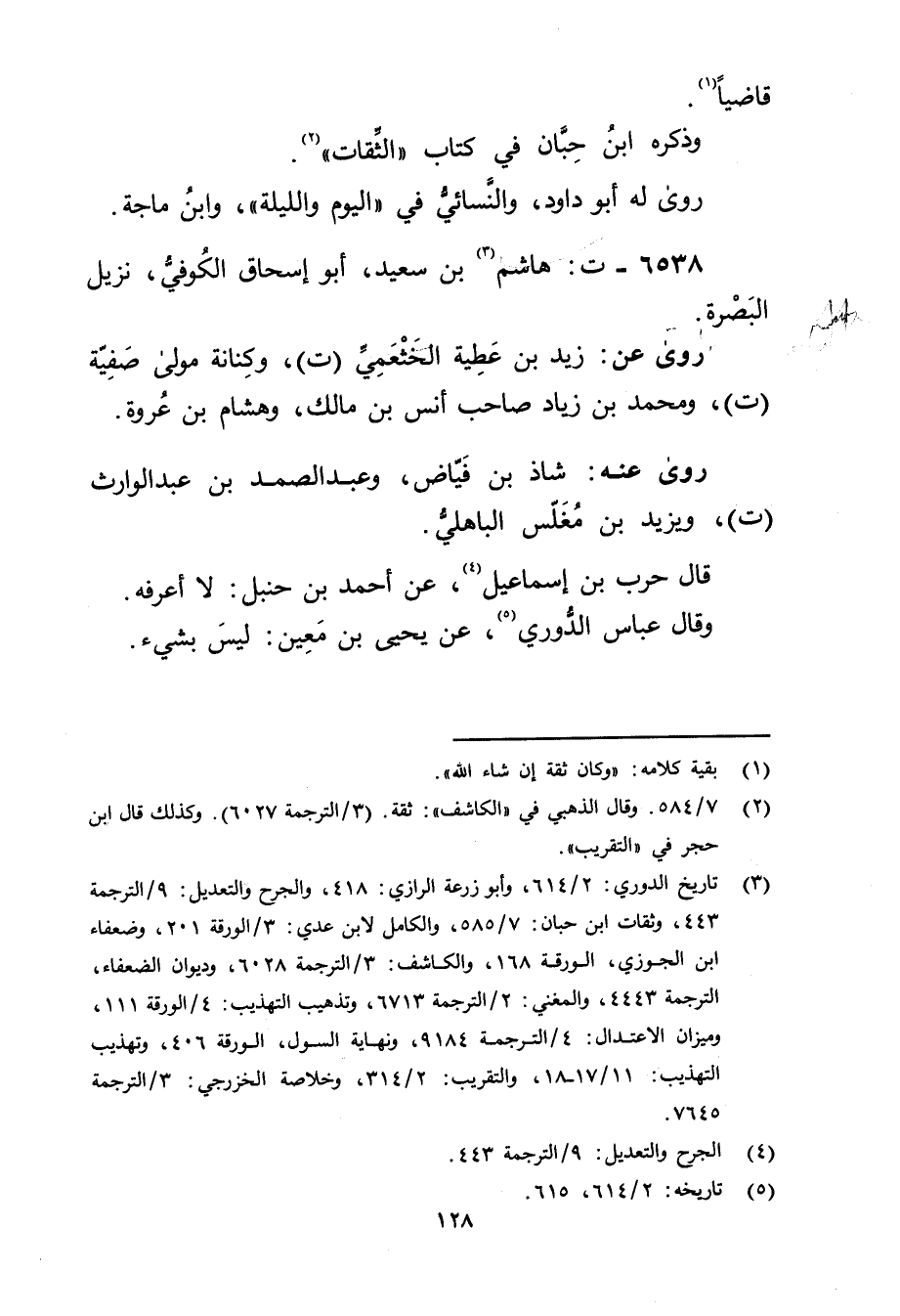 (3) تاريخ الدوري: 2 / 614، وأبو زُرْعَة الرازي: 418، والجرح والتعديل: 9 / الترجمة 443، وثقات ابن حبان: 7 / 585، والكامل لابن عدي: 3 / الورقة 201، وضعفاء ابن الجوزي، الورقة 168، والكاشف: 3 / الترجمة 6028، وديوان الضعفاء، الترجمة 4443، والمغني: 2 / الترجمة 6713، وتذهيب التهذيب: 4 / الورقة 111،