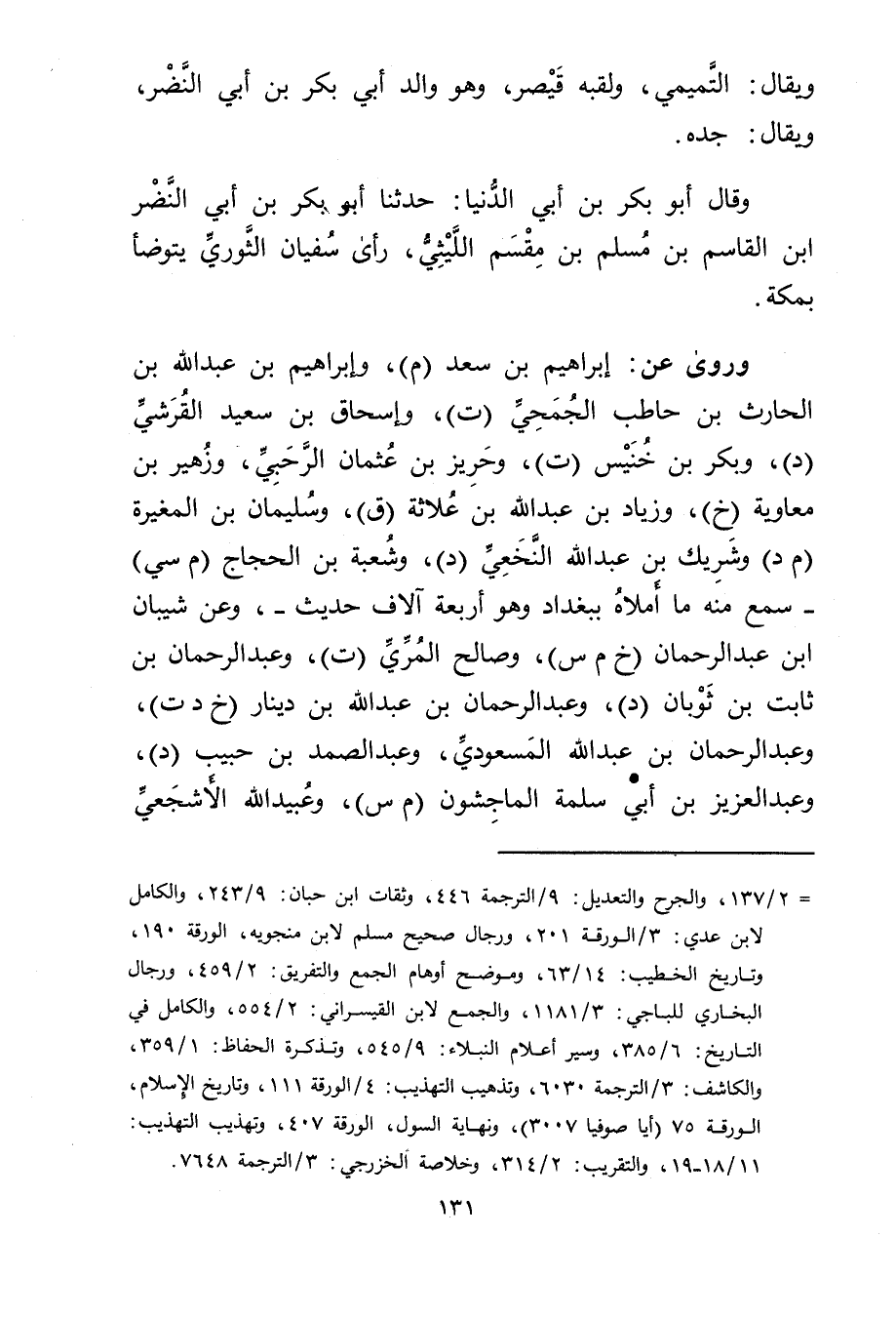 = 2 / 137، والجرح والتعديل: 9 / الترجمة 446، وثقات ابن حبان: 9 / 243، والكامل لابن عدي: 3 / الورقة 201، ورجال صحيح مسلم لابن منجويه، الورقة 190، وتاريخ الخطيب: 14 / 63، وموضح أوهام الجمع والتفريق: 2 / 459، ورجال البخاري للباجي: 3 / 1181، والجمع لابن القيسراني: 2 / 554، والكامل في التاريخ: 6 / 385، وسير أعلام النبلاء: 9 / 545، وتذكرة الحفاظ: 1 / 359، والكاشف: 3 / الترجمة 6030، وتذهيب التهذيب: 4 / الورقة 111، وتاريخ الاسلام، الورقة 75 (أيا صوفيا 3007) ، ونهاية السول، الورقة 407، وتهذيب التهذيب: 11 / 18 - 19، والتقريب: 2 / 314، وخلاصة الخزرجي: 3 / الترجمة 7648.